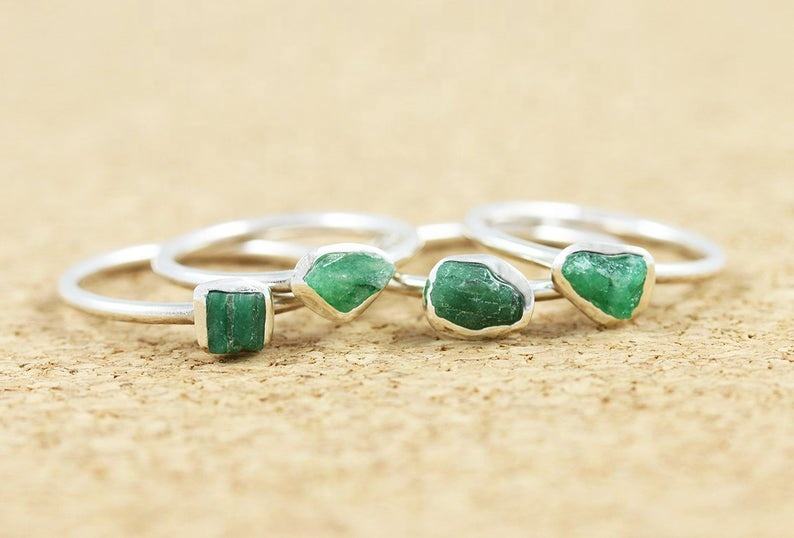 Women's Classic 92.5 Sterling Silver Gold Plated Ring Natural Green Emerald Untreated Rough Gemstone May Birthstone High Fashion