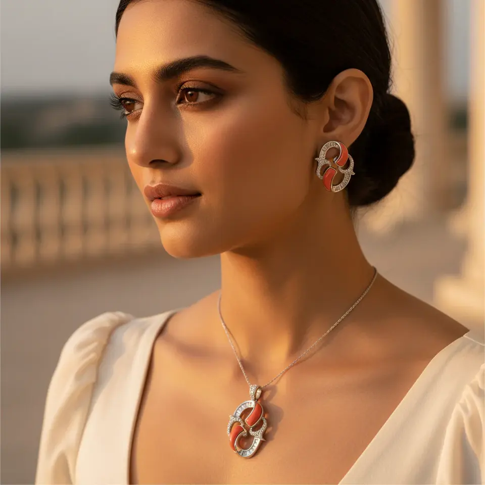 Women's Classic Trendy Silver Coral Pendant Earrings Set Gold Rose Gold Plating Diamond Sapphire Stones for Parties Weddings