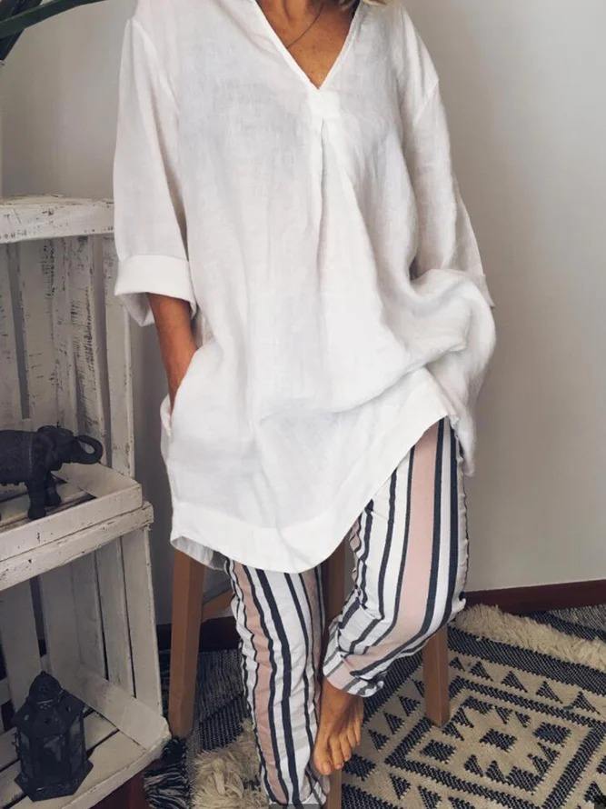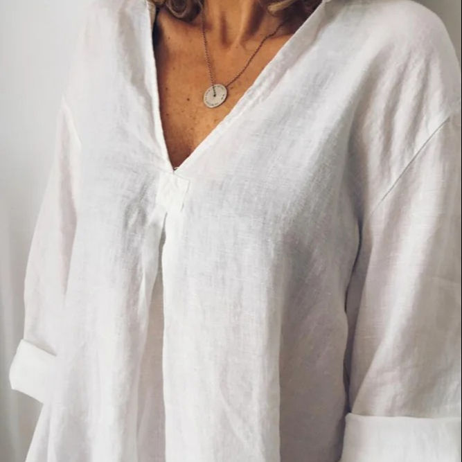 Women's Clothing Cotton and Linen Fabric White Color Sexy Long Sleeve with Side Pocket v Neck Casual Dress
