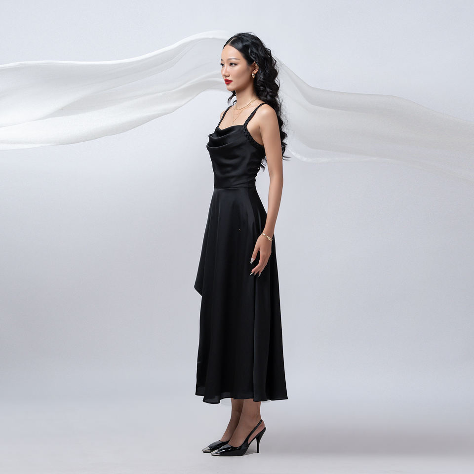 Soft draped neckline with flowy asymmetricFeature