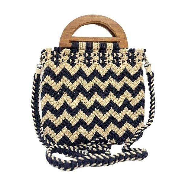 Women's Color Blocked Woven Bag with Wooden Handle Small Crossbody Handbag for Beach Vacation Zip Closure