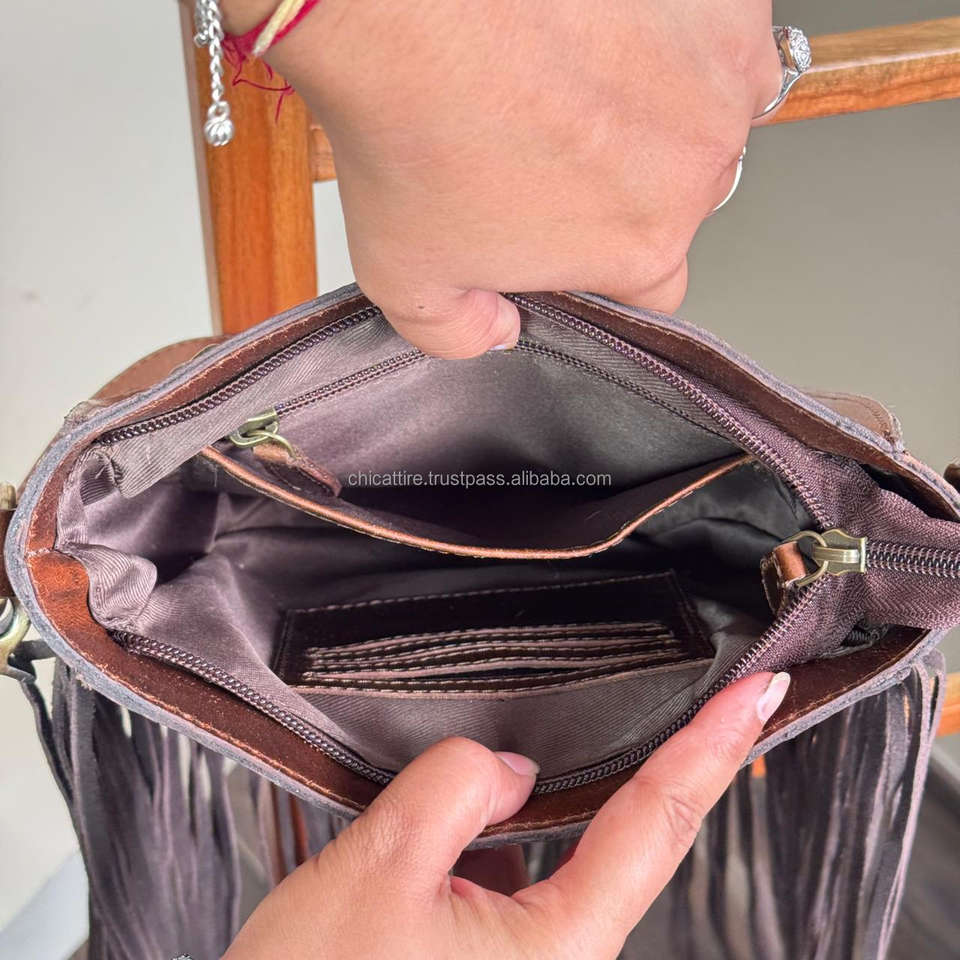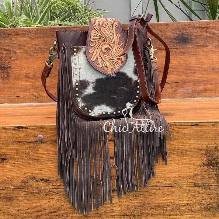 Product name:Hand Tooled Cowhide Leather Fringe Crossbody Bag
