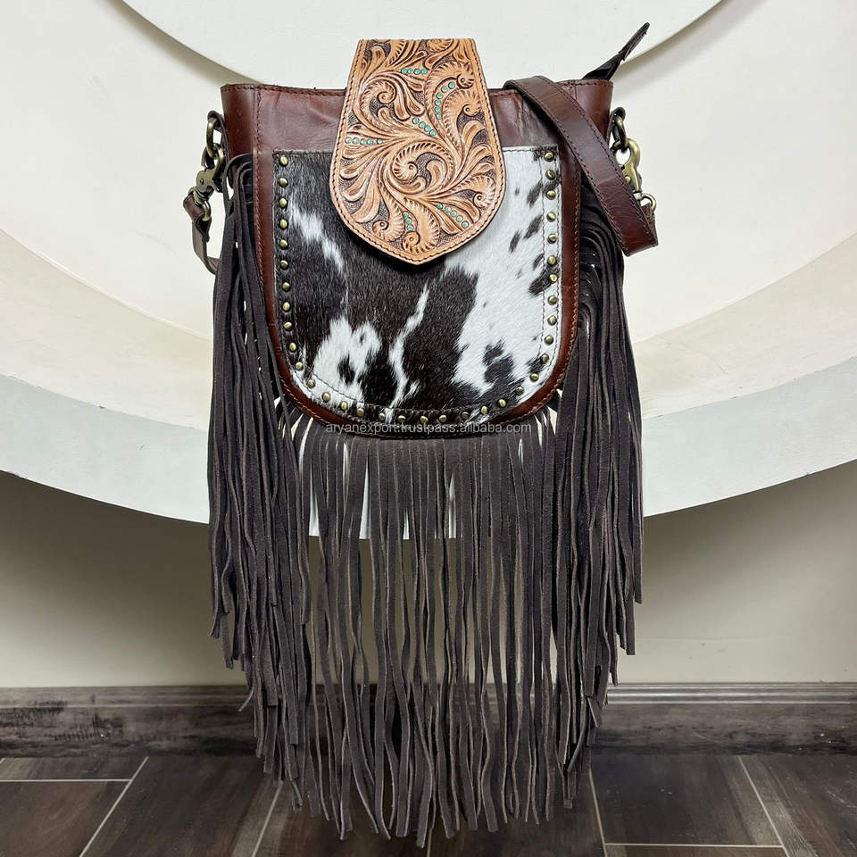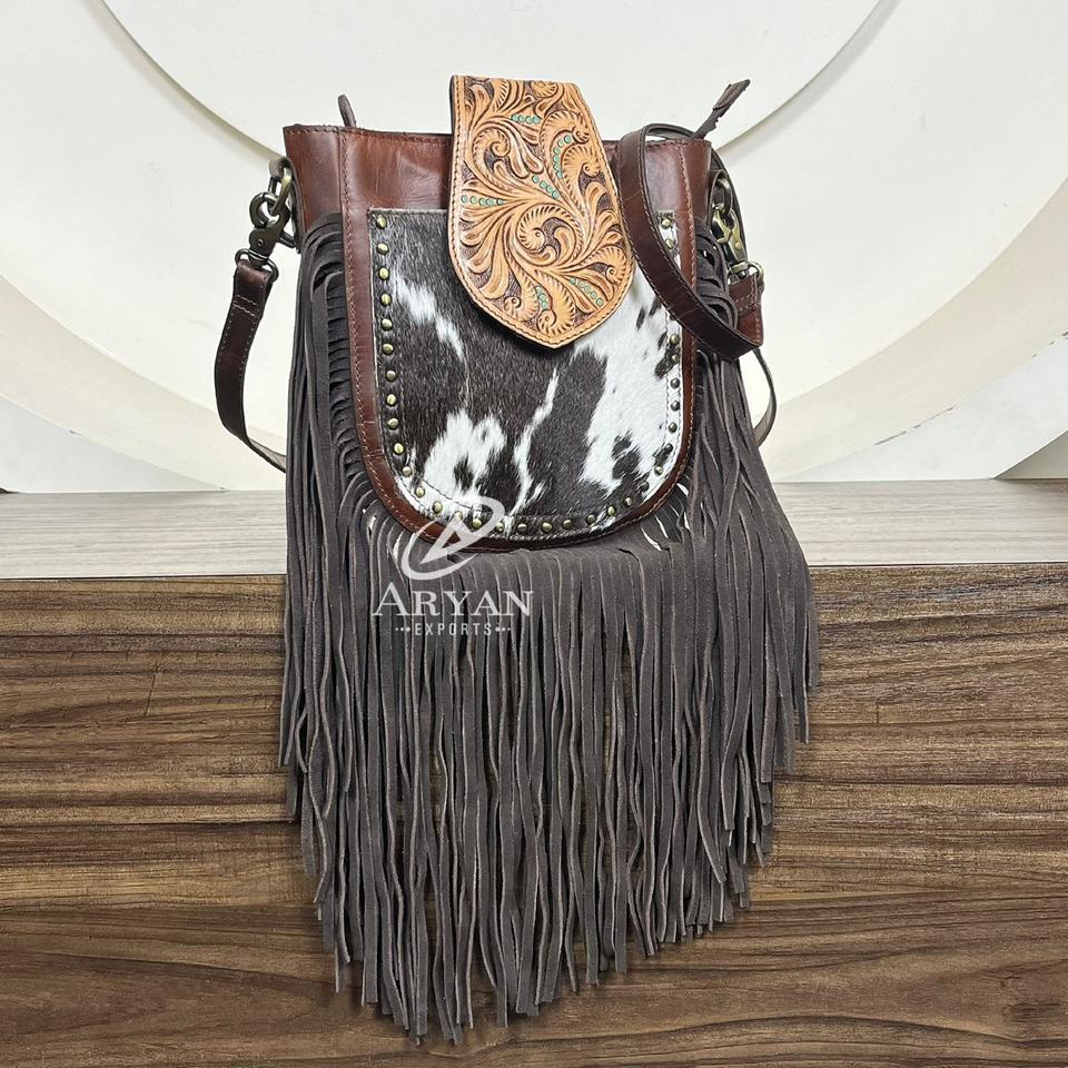 Hand Tooled Cowhide Leather Fringe Crossbody Bag