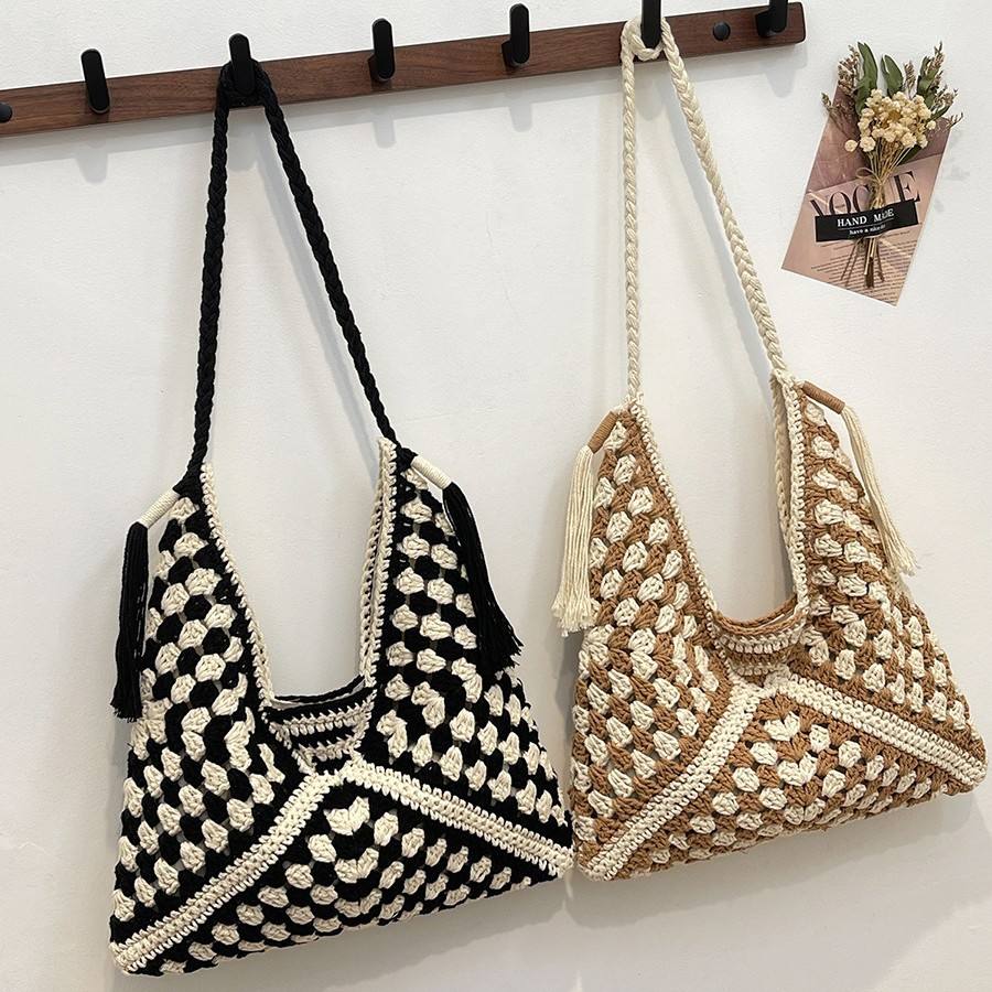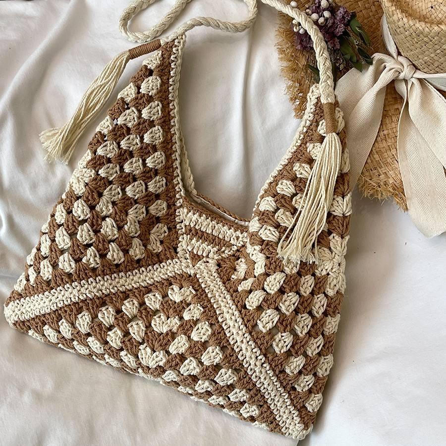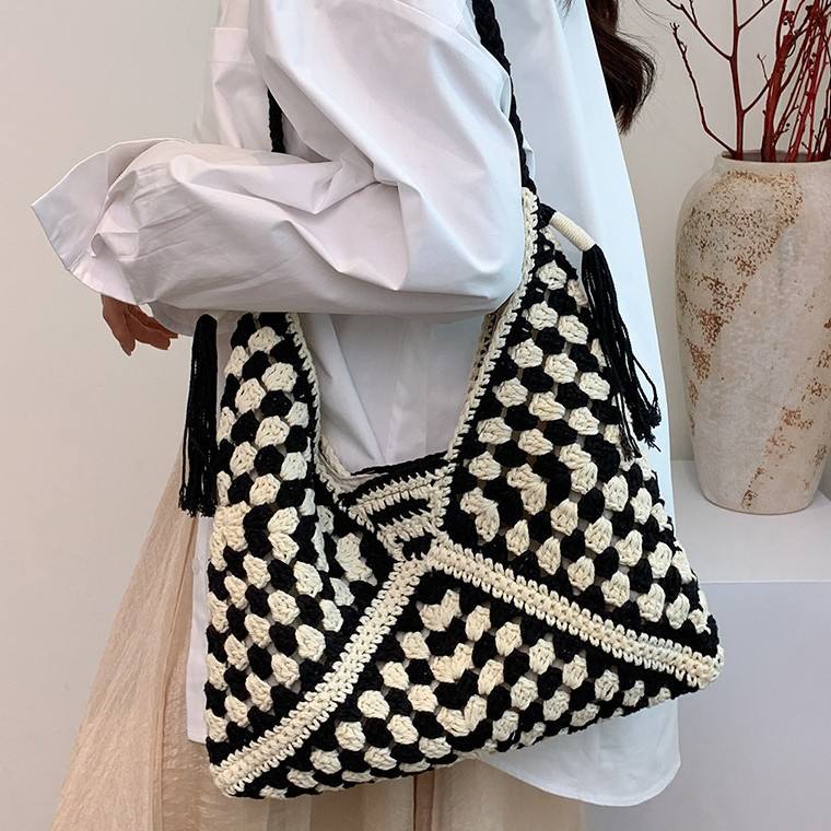 Women's Crochet Bag Tote Large-Capacity Artistic Style Seaside Vacation Knitted Bag Fashionable Open Shoulder Beach Bag