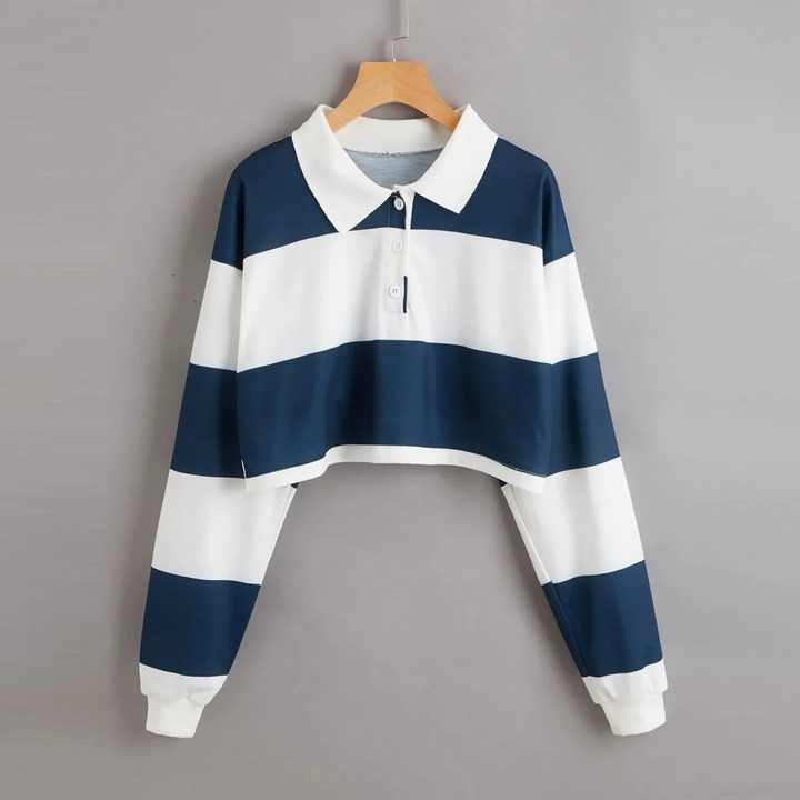 Women's Cropped Long Sleeve T-Shirt Top for Polo Collar Sweatshirt with Rainbow Stripe Tweed Style Knitted Breathable Top