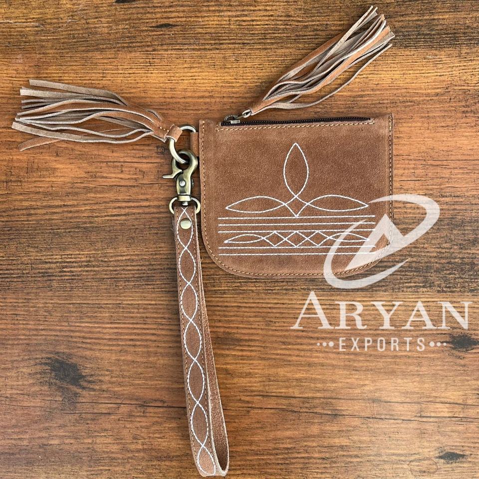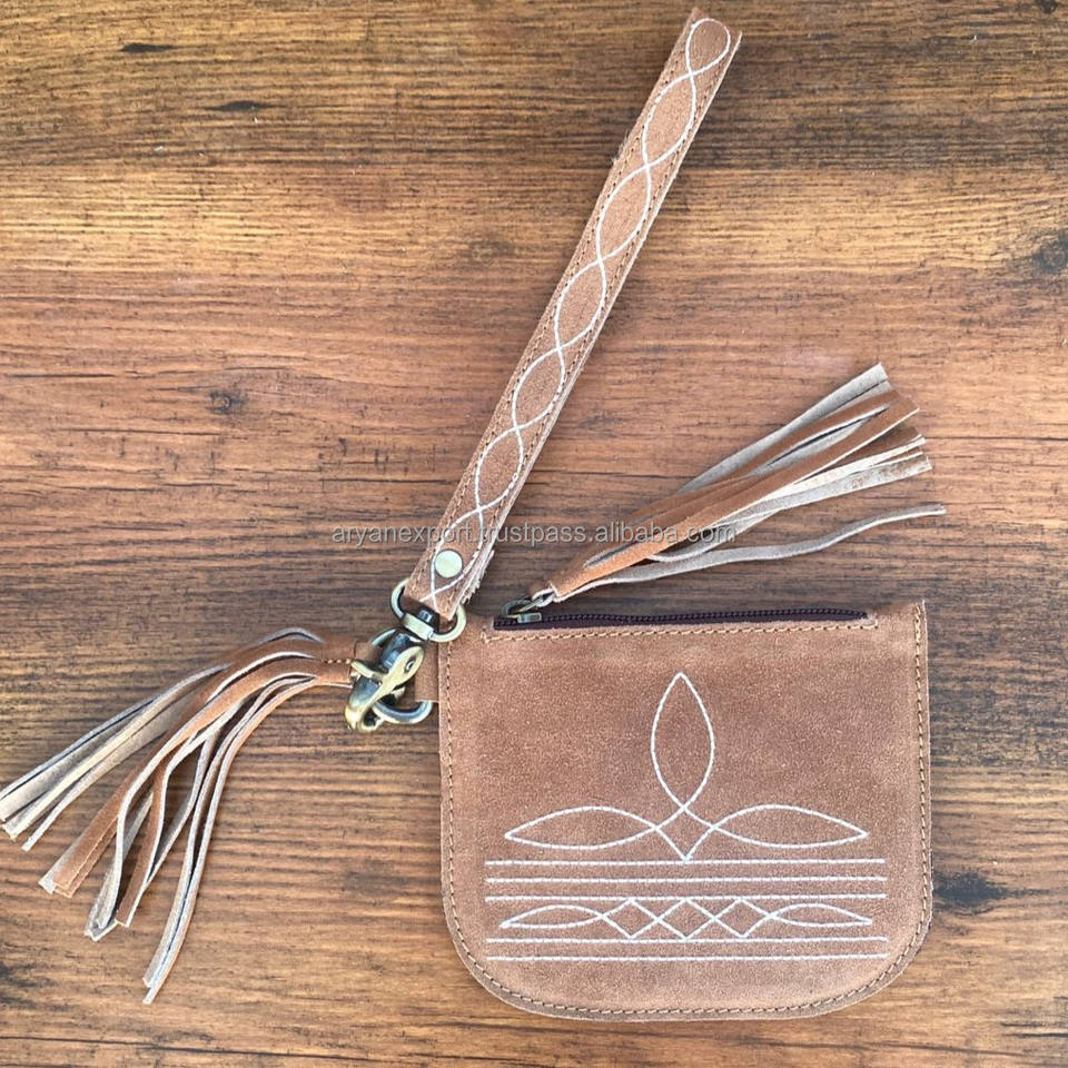 Women's Custom Design Boot Stitch Suede Leather Card Holder Zipper Coin Wallet Portable Keychain Coin Pocket Wristlet Dual Pouch