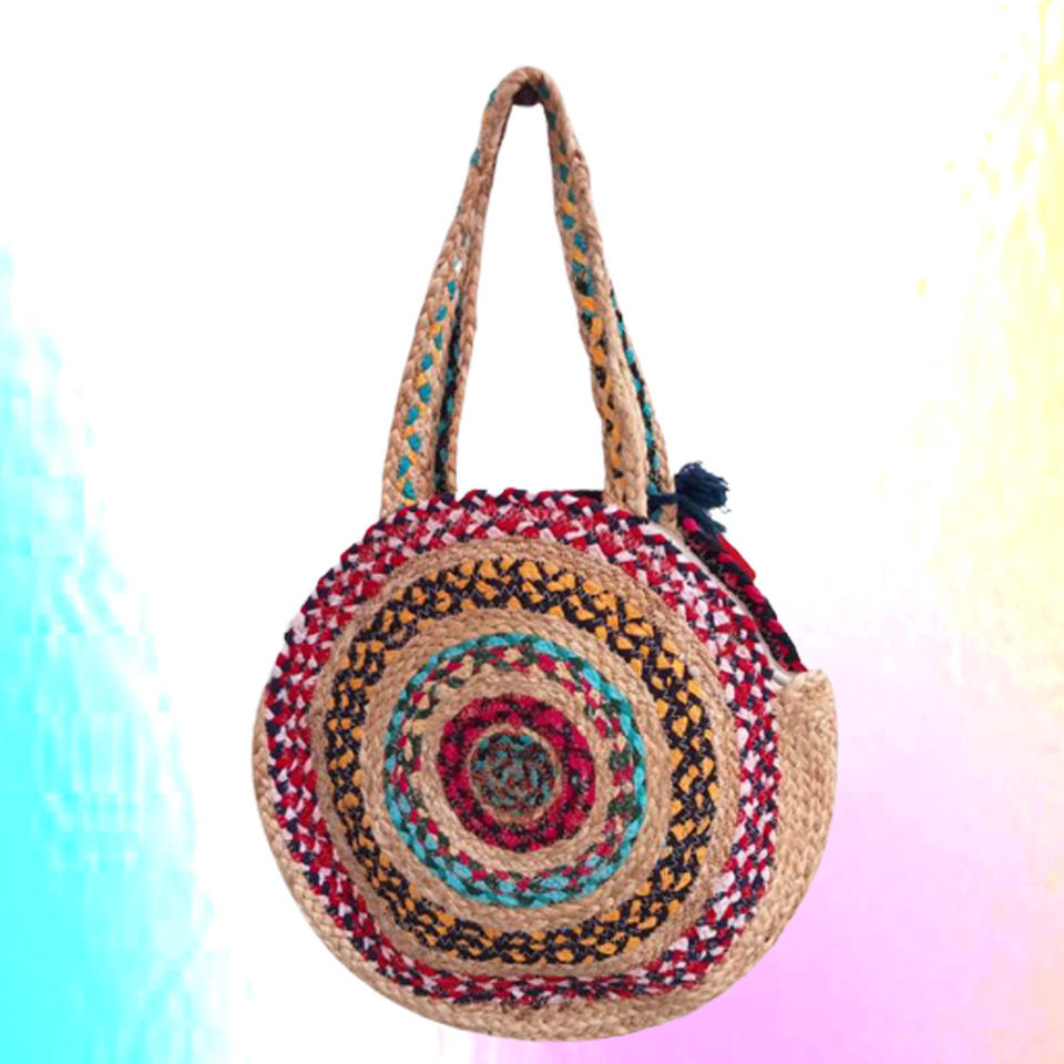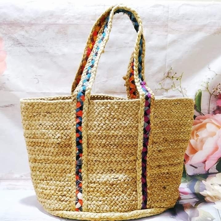 Women's Custom Summer Beach Tote Bags Wholesale Cream Cotton Canvas Lining with Braided Jute Waterproof and Long-Handle