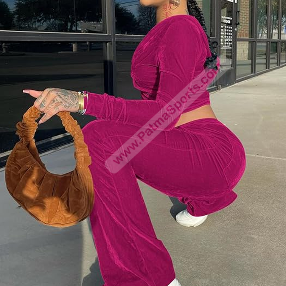 Women's Custom Velour 100% Cotton Track Suits Casual Solid Pattern Activewear Short Cropped Hoodie Flared Pant Trending Design