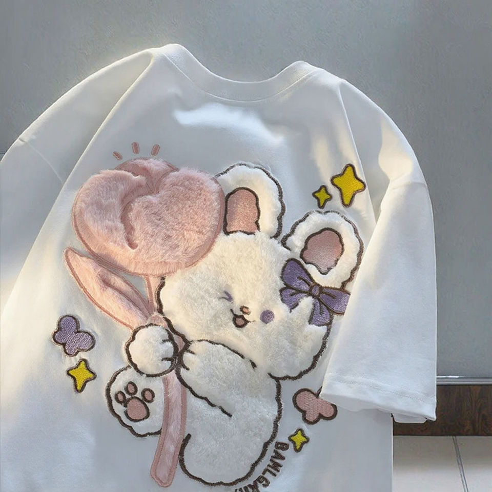 Women's Customized 3D Cute Rabbit T-shirt Cotton Short Sleeved Top with Plush Embroidered Cartoon Loose Fitting Trendy Design