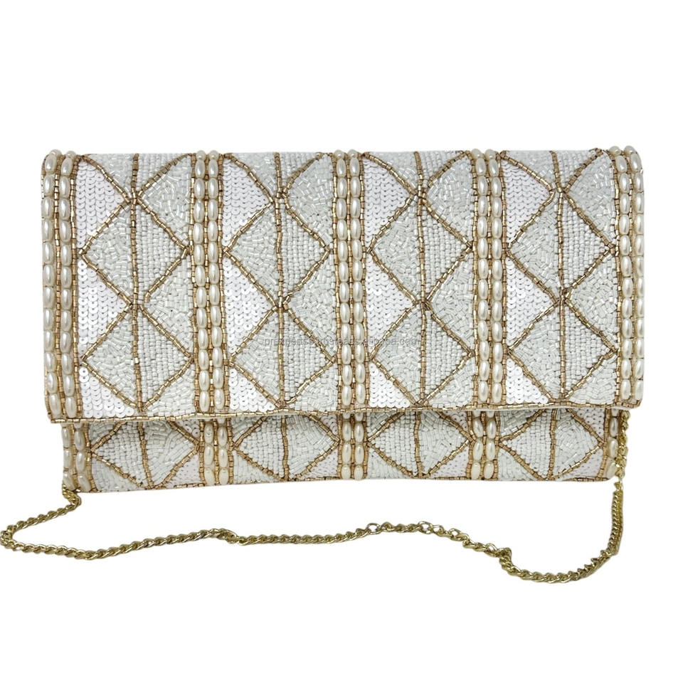 Women's Designer Handmade Wedding Evening Bag White Bride Beaded Clutch Durable Glass Bead Sequin Casual Handbag for Bridal