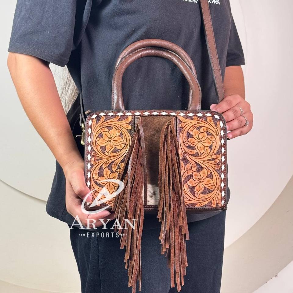 Product Name:Hand Tooled Cowhide Leather Fringe Mini Tote Bag