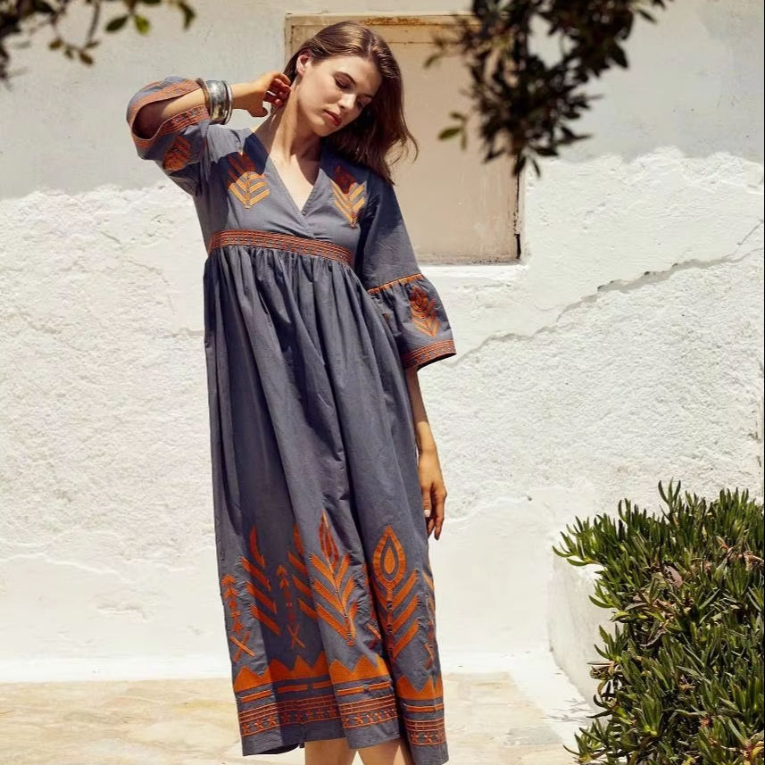 Women's Elegant Bohemian Cotton Mini Dress Deep V-Neck Tassel Decoration Flower Embroidery Woven Back Plus Size Casual Maxi