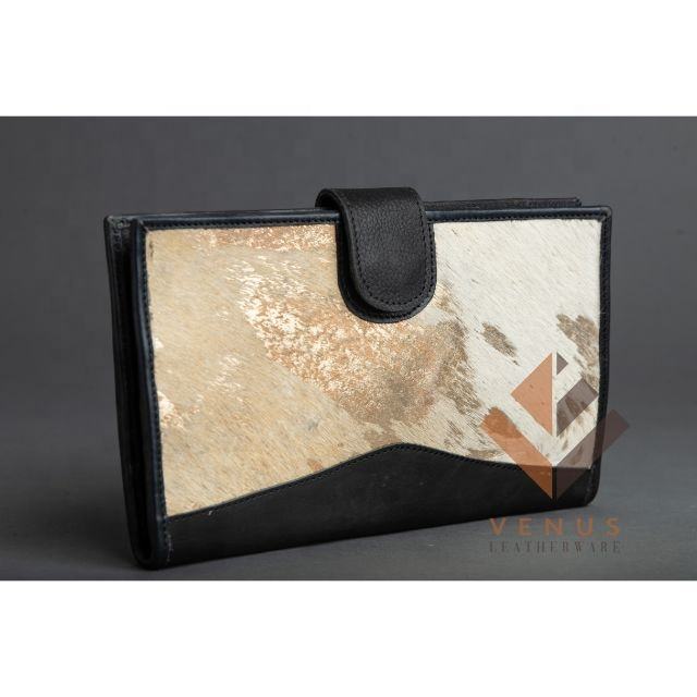 Women's Elegant Bohemian Style Cowhide Fur Leather Clutch Wallet Long Genuine Brown Anti-Theft Purse Bag Zipper Closure Elegant