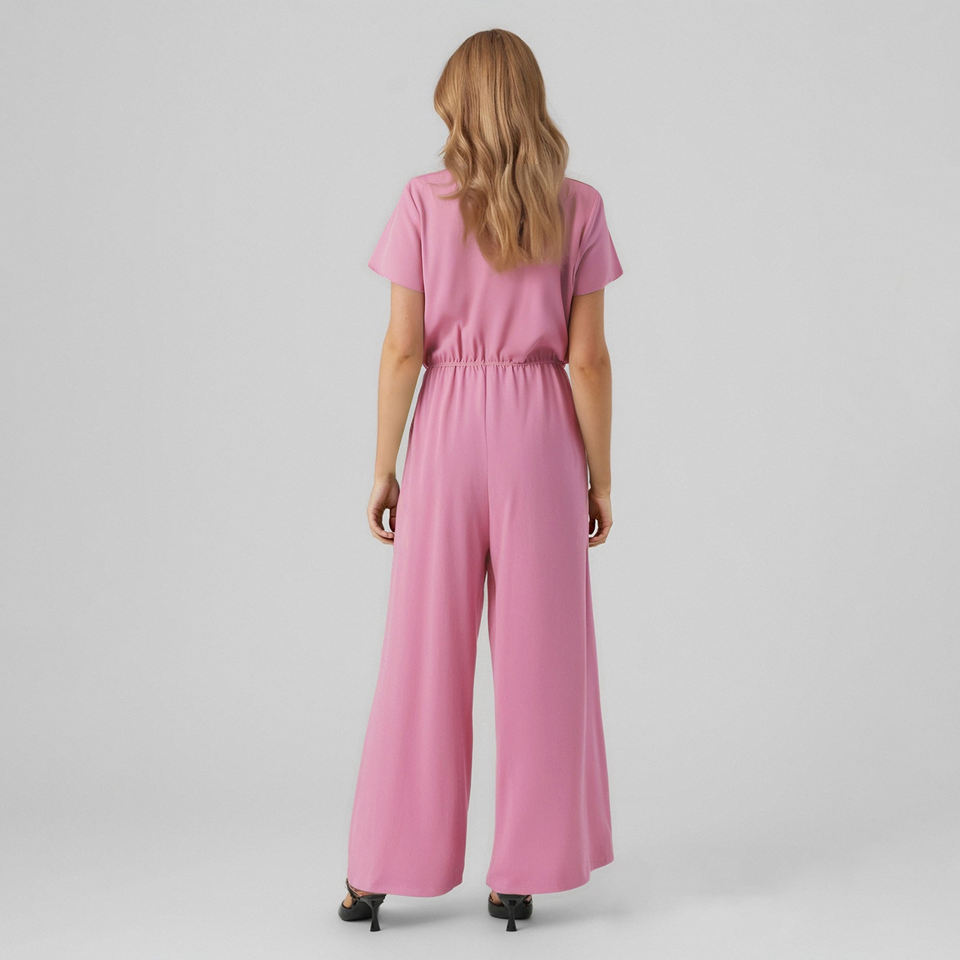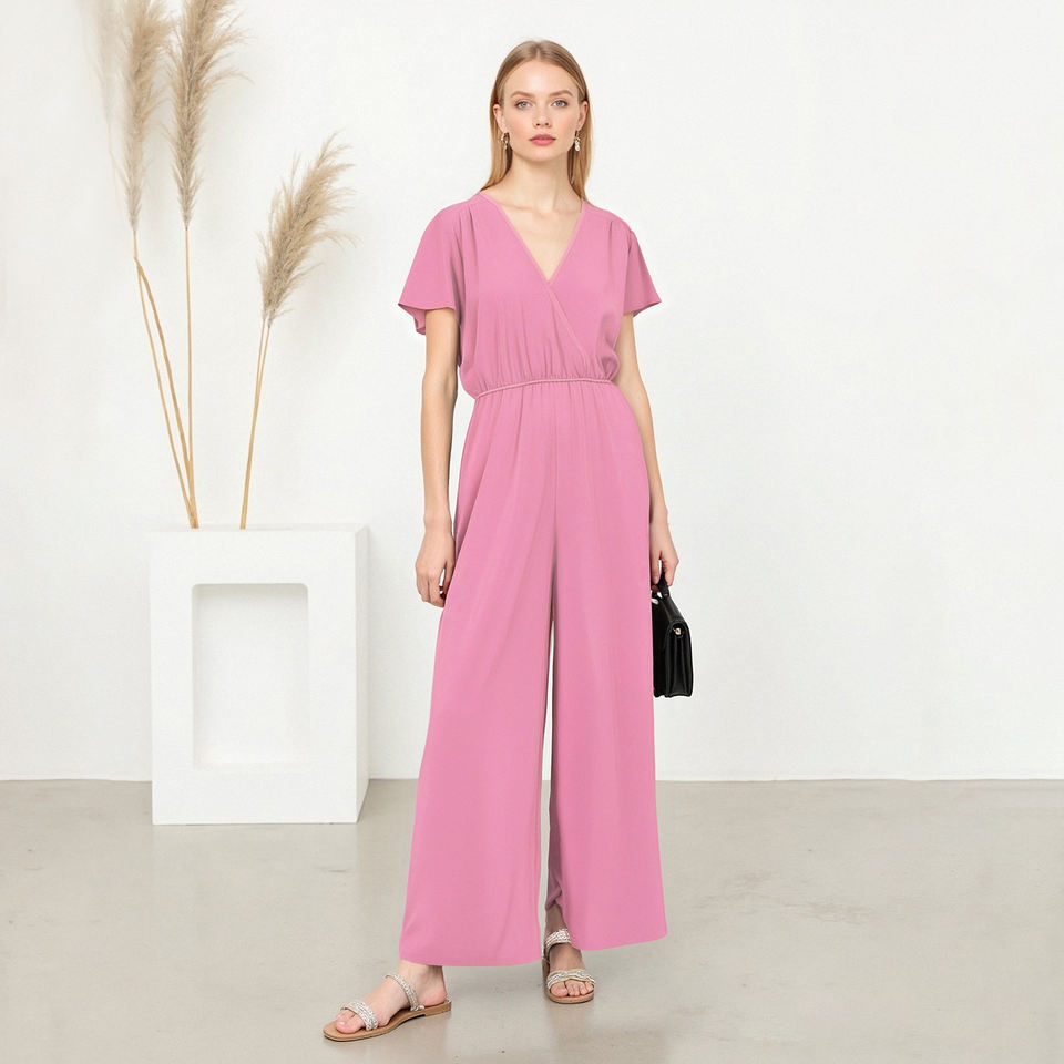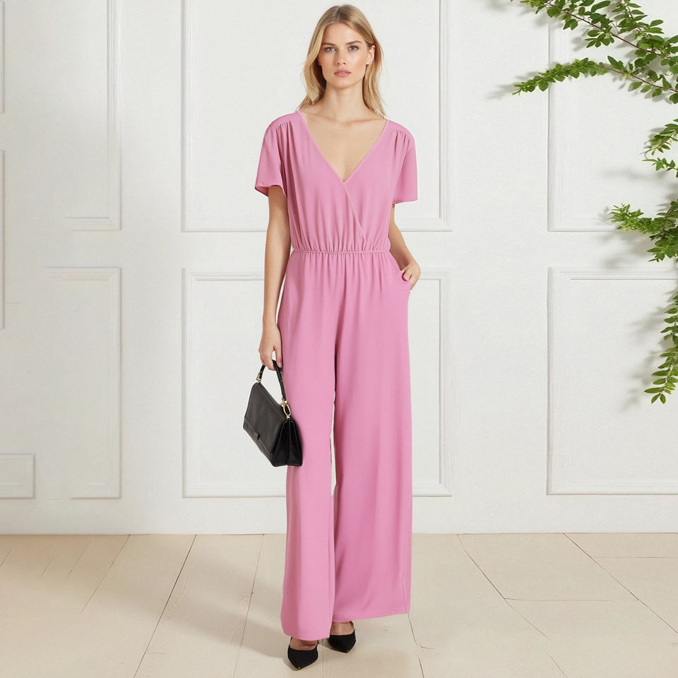 Women's Elegant Casual Batwing Sleeve V Neck Plain Wide Leg Jumpsuit