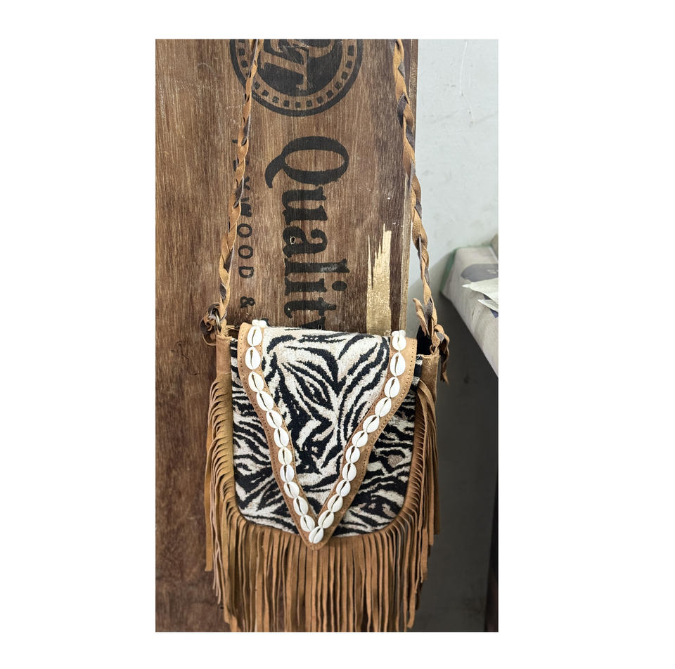 Women's Elegant Indian Bohemian Style Designer Cowgirl Cowhide Sling Bag Handmade Leather Beaded Shoulder Bags Zipper Fringes