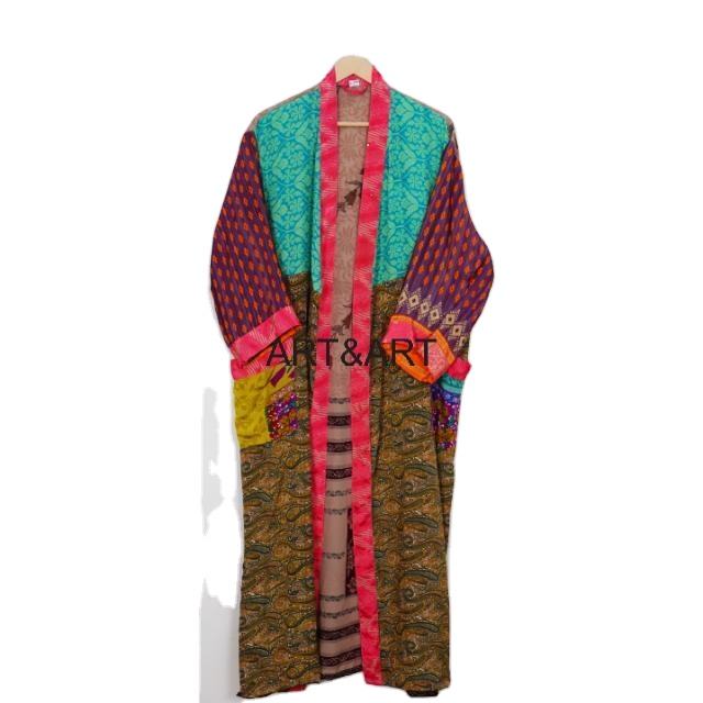 Women's Elegant Luxury Vintage Patchwork Silk Long Kimono Shower Robe Bridesmaids Recycled Indian Sari with Belt Summer Autumn