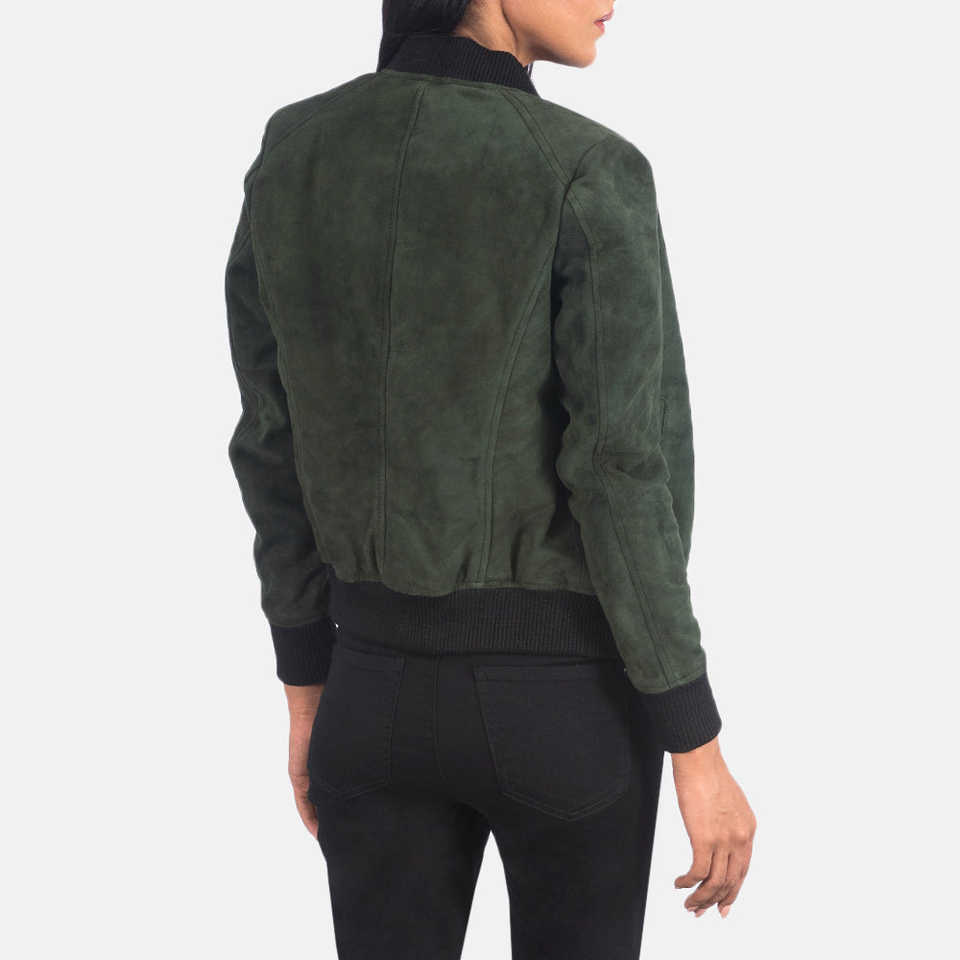 Women's Elegant Olive Green Suede Leather Jacket Modern Bomber Design with Stand Collar Lightweight for Casual Wear Logo Front