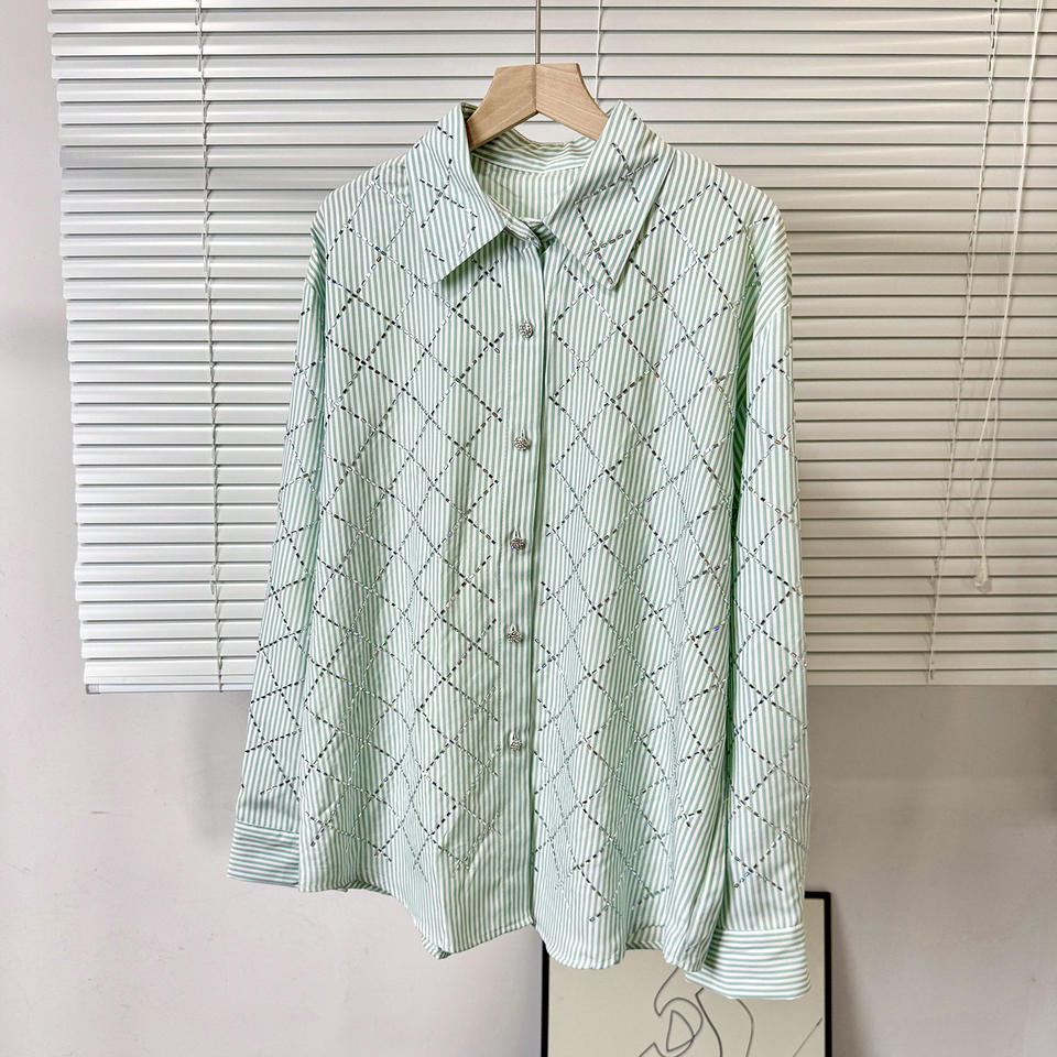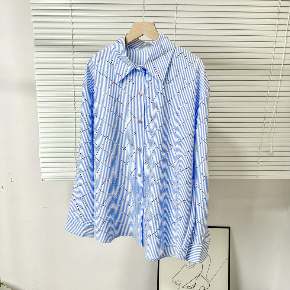 Women's Elegant Rhinestone Diamond-Patterned Casual Loose Lightweight Summer Breathable Long-Sleeve Collared Shirt Top