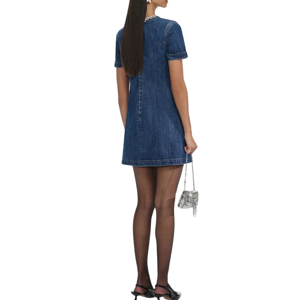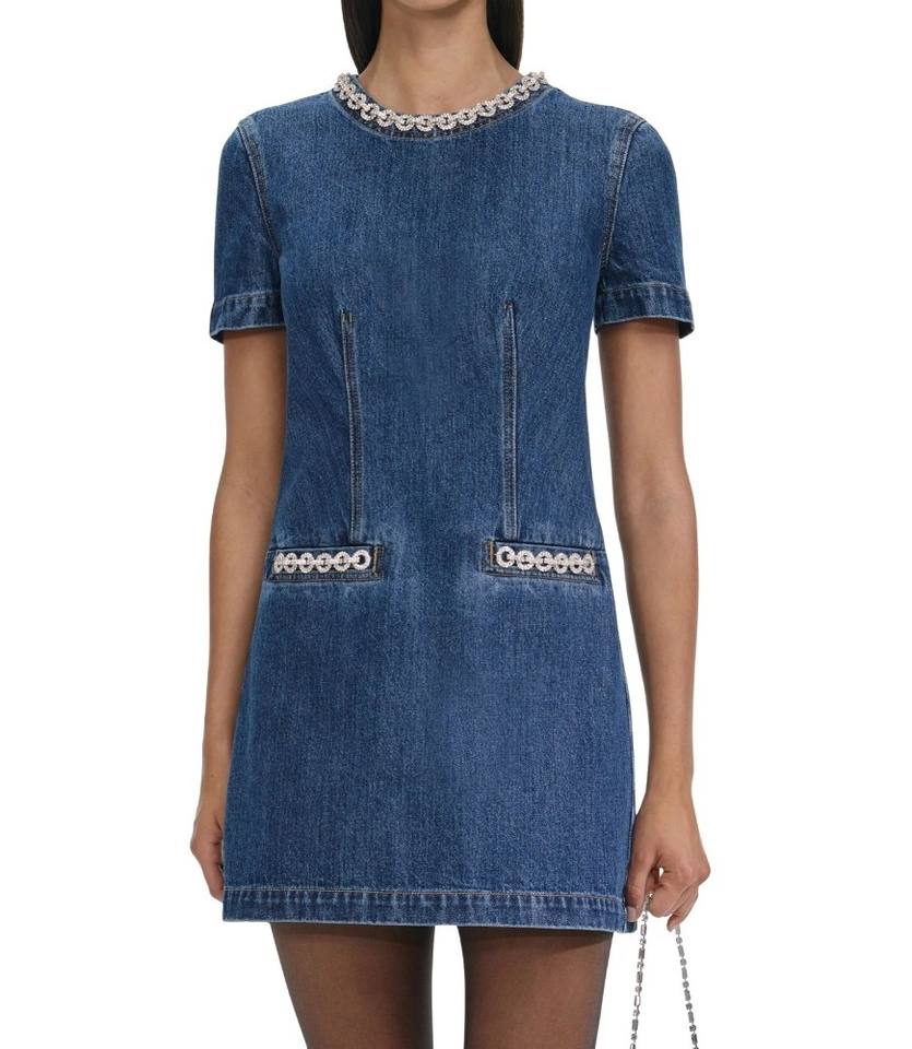 Women's Elegant Slim Fit Short Sleeve A-Line Denim Mini Dress Casual Summer Wear with Pocket Detail Woven Weave