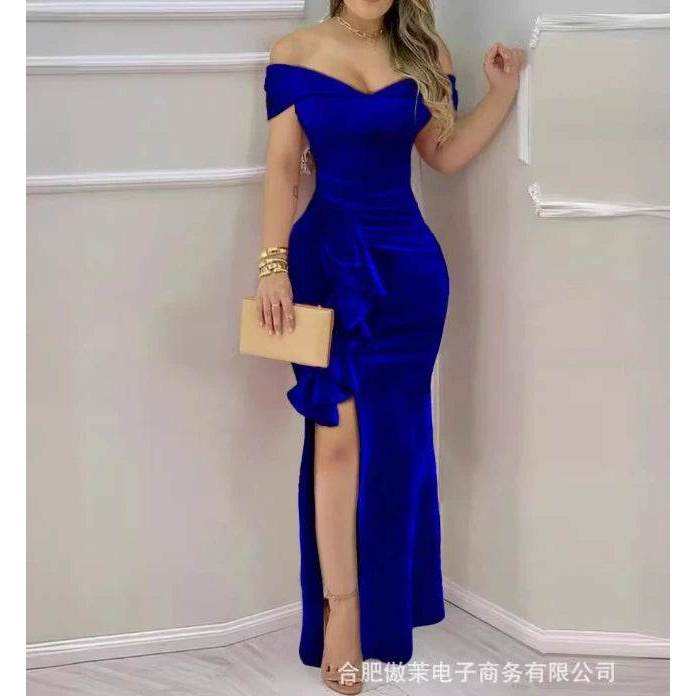 Women's Elegant Velvet One Shoulder Split Evening Dress New Fashion Short Maxi Sleeve for Commuting & Party