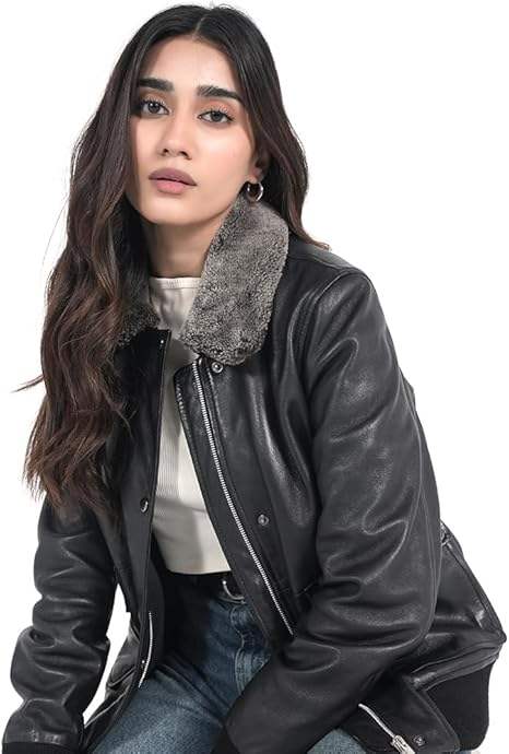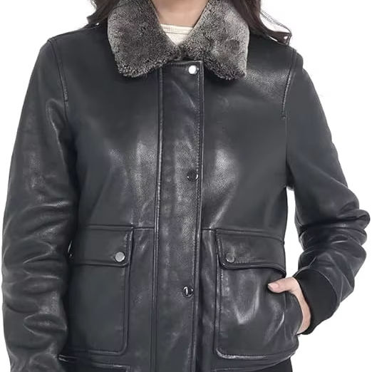 Women's Elite Craft Black Lambskin Bomber Jacket Breathable Smooth Finish Signature Logo Accent Premium Zipper Closure Faux Fur