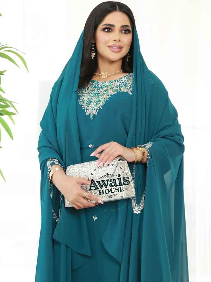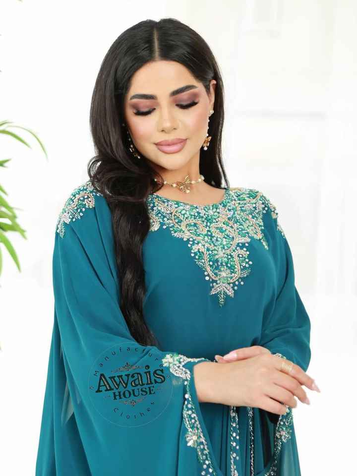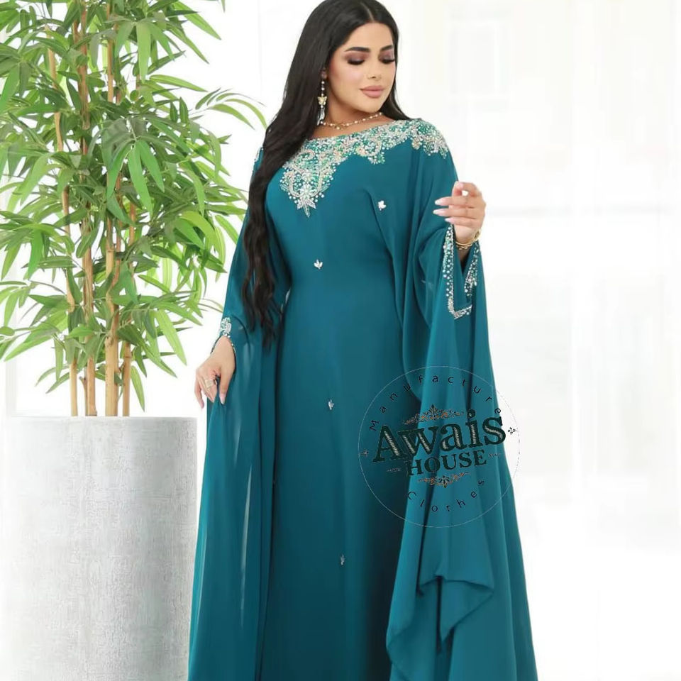 Women's Ethnic Lightweight Plus Size Floor-Length Hand Beaded Sequined High Neck Long Sleeve Georgette Flared Hem Kaftan Abaya