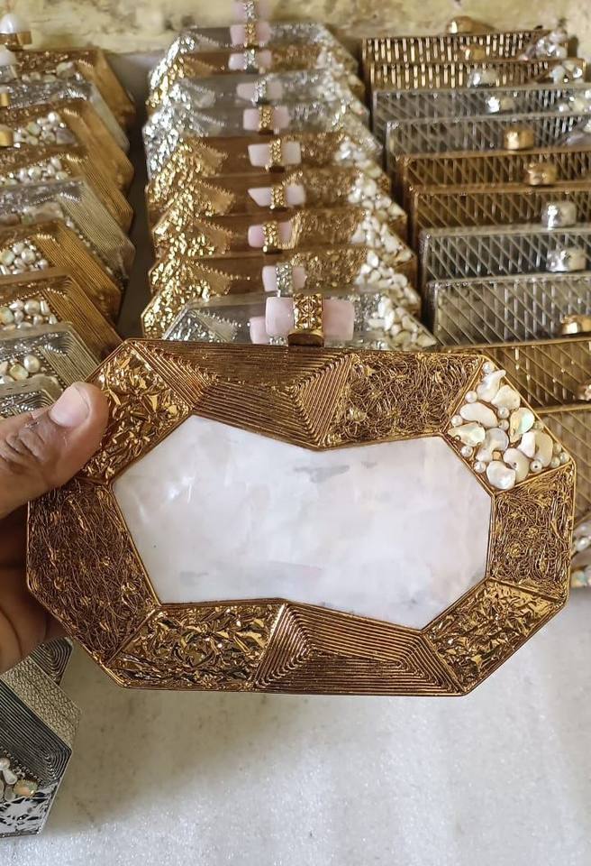 Women's Evening Party Fusion Republik MOP Brass Clutch Square Stone Studs Magnetic Closure Polyester Lining Handmade Chain Strap