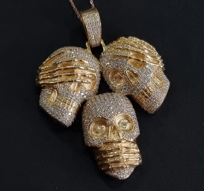 Women's Fashion 18k Gold Pendant Highest Quality Iced Out Three Wise Skulls Necklace With Moissanite Diamond