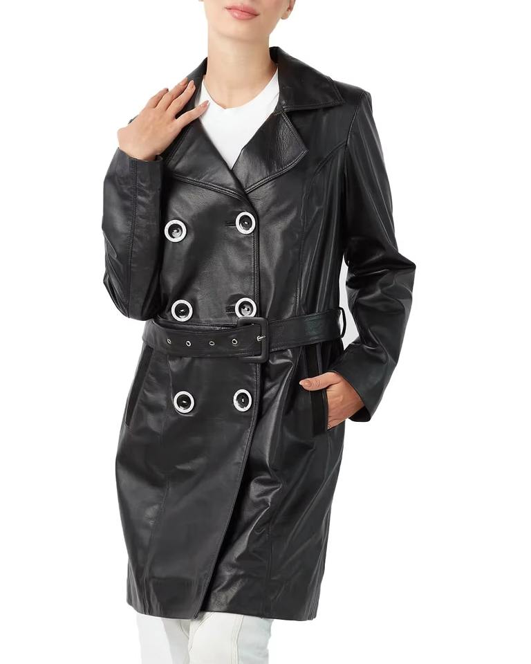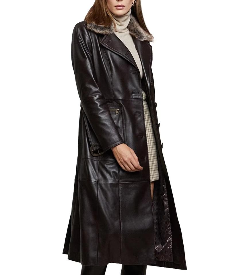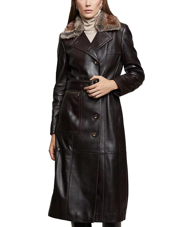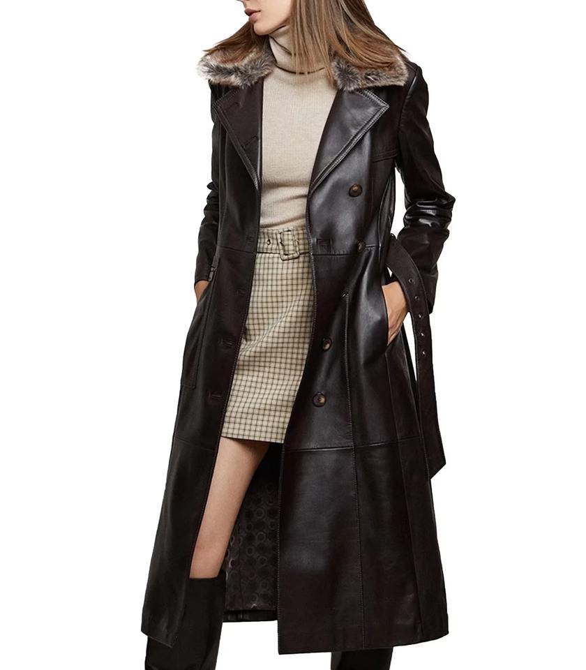 Women's Fashion Genuine Lambskin Leather Trench Coat Fox Fur Collar Button Long Length Breathable Eco-Friendly Faux Fur Lining