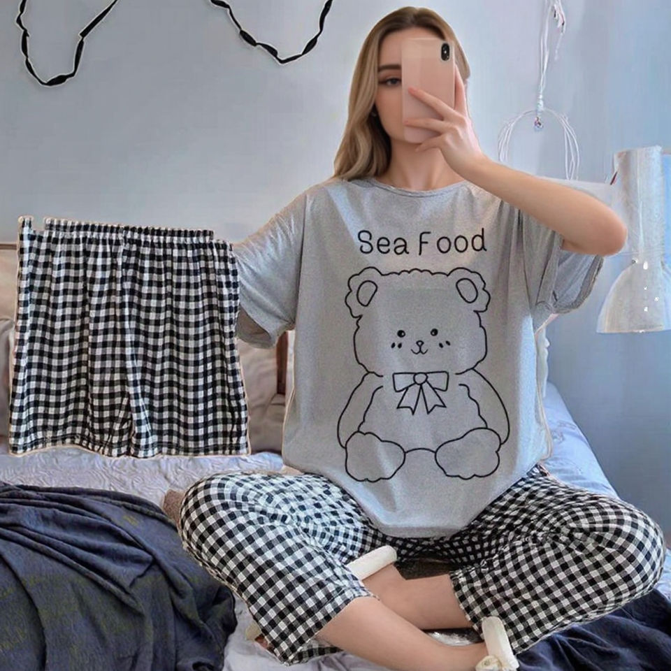 Women's Fashion Pajamas Set Leopard Floral Print Short-Sleeved Loungewear 3 Pcs Nightgown Winter Autumn Elastic Waist Front