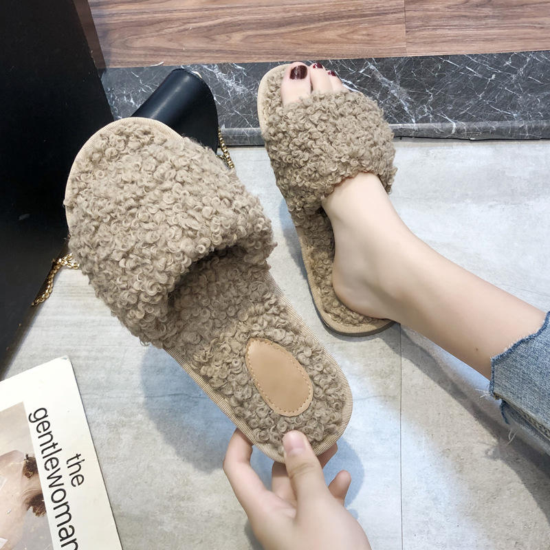 Women's Fashion Trend Winter for Slippers Plush Warm with Single Strap and Non-Slip Flat Sole for Autumn Beach Use