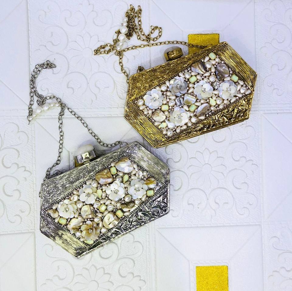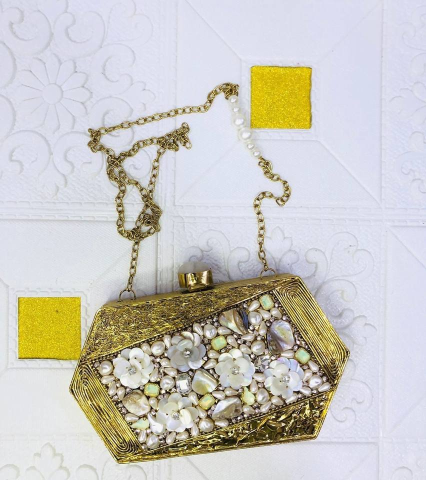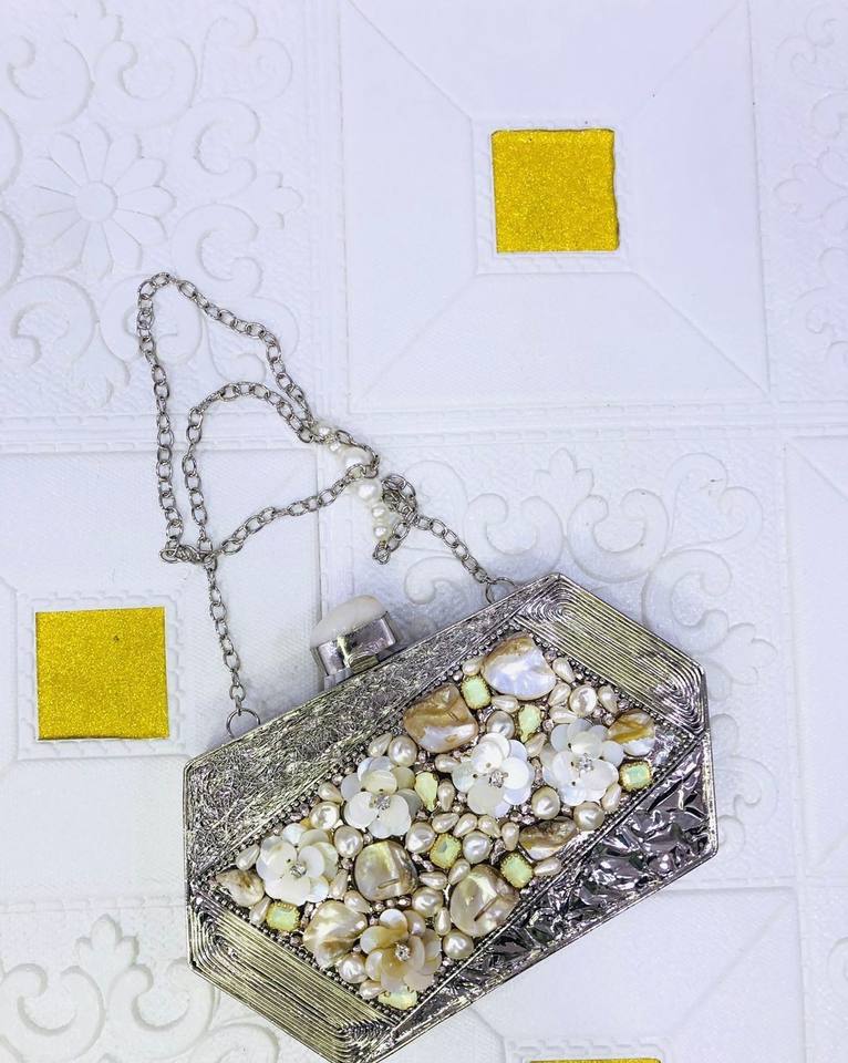 Women's Fashionable Evening Party Fusion Republik Crystal Square Stone Studs MOP Clutch Magnetic Closure Chain Strap Polyester