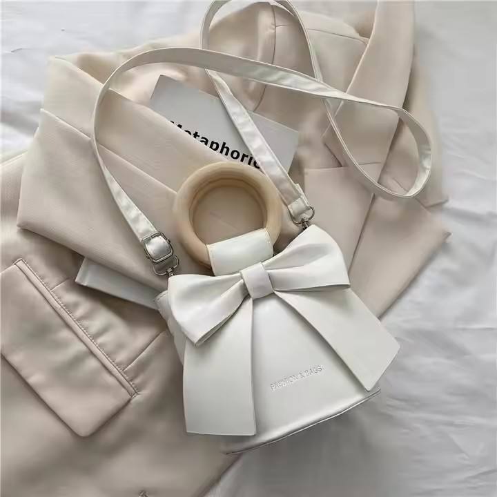 Women's Fashionable PU Leather Cross Body Bucket Bag PVC Lining Bow Shoulder Messenger Design Custom Logo for Lady's Spring