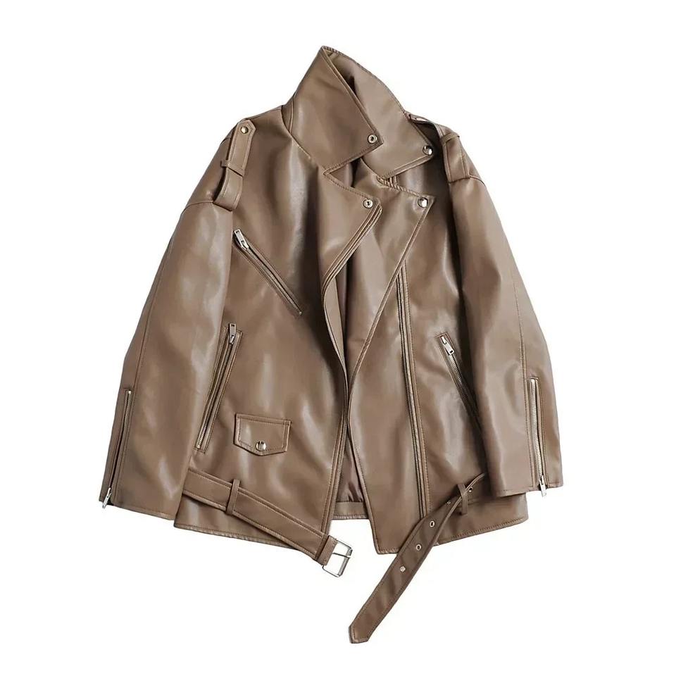Women's Faux Leather Bomber Jacket Retro Long Sleeves Lapel Zip Pocket Elastic Cuffs Outerwear Fall Winter Female Chic Coat