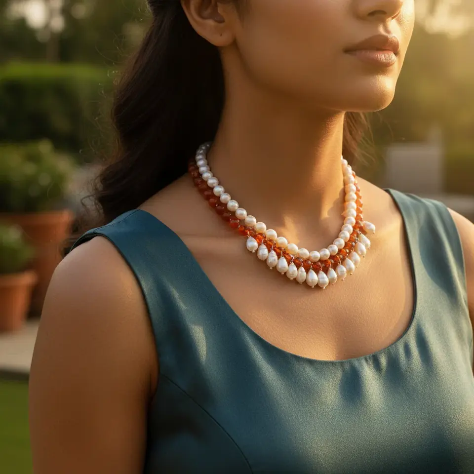 Women's Fine Beaded Necklace with Pearls & Carnelian Gems Elegant Gemstone Jewelry