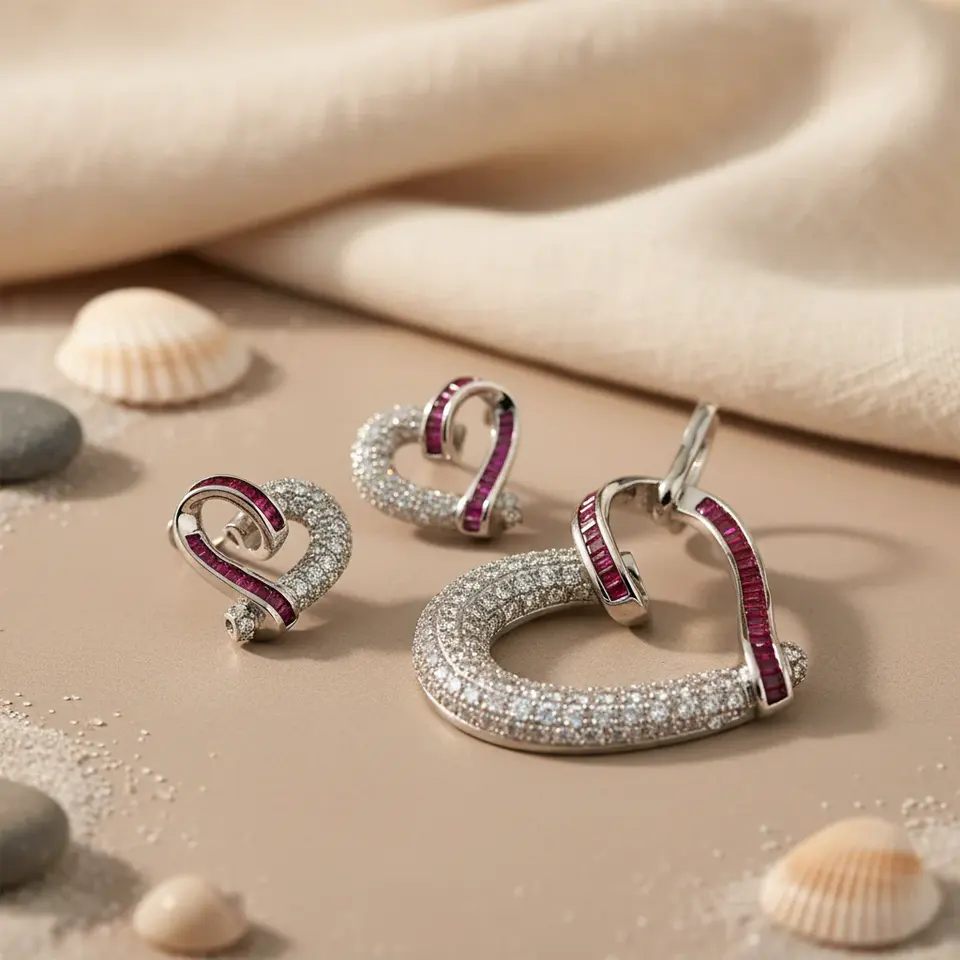 Women's Fine Jewelry Set Silver Ruby Heart Pendant Earrings with Diamond and Zircon Gold Rose Gold Plated for Weddings Parties