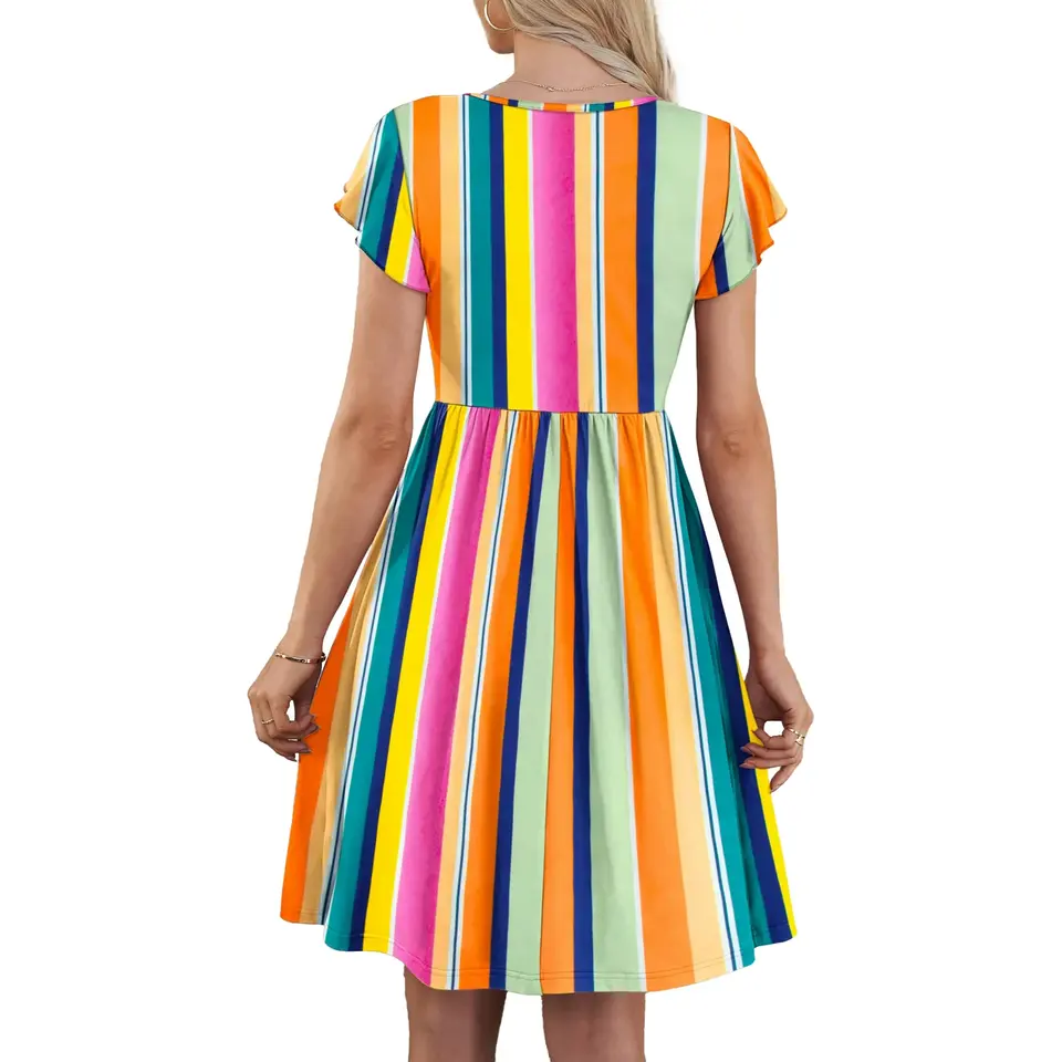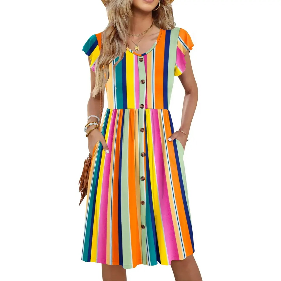 Women's Floral Midi Pocket Dress Rainbow Striped Summer Sundress V-Neck Ruffle Sleeve Button Fit Woven Regular Fit Plain Dyed