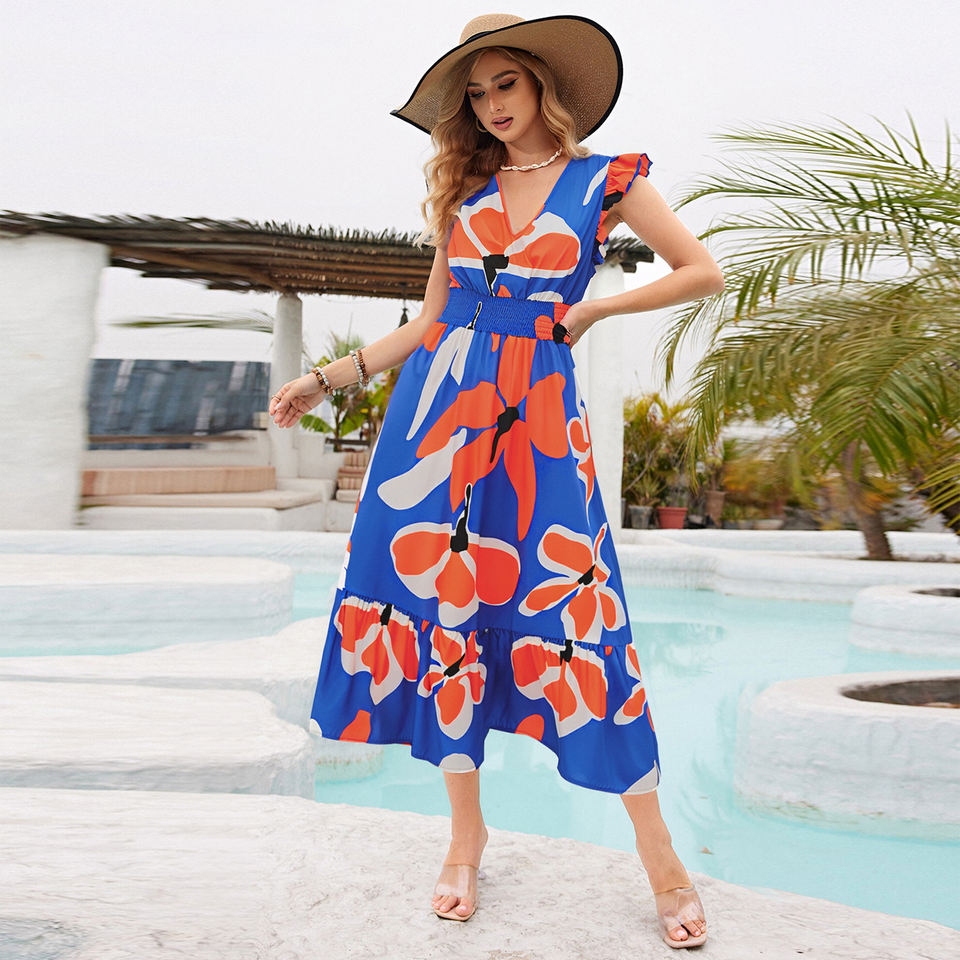 Women's Floral Print V-Neck Dress Ruched Waist Ruffle Sleeve Long Maxi Casual Style with Ruched Trim Size XS for Spring Summer