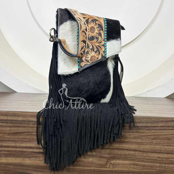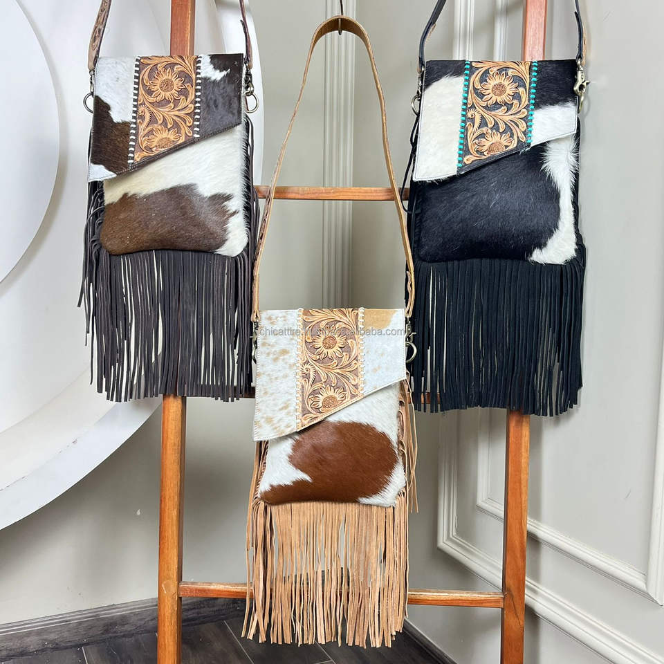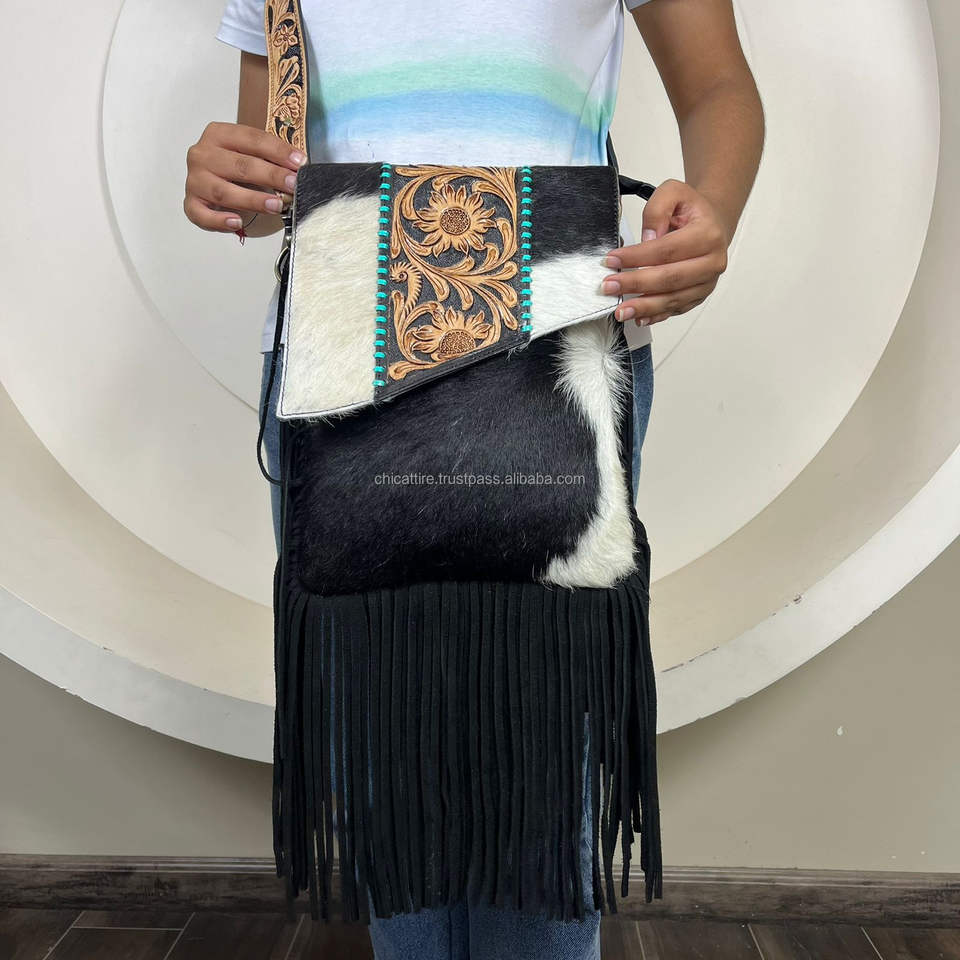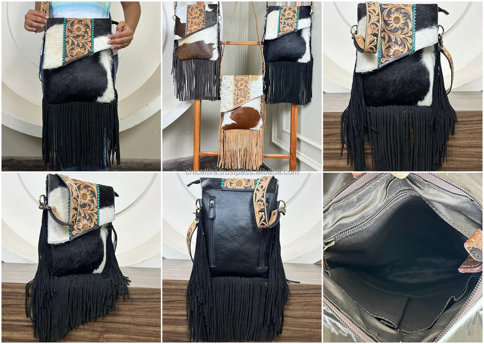 Women's Genuine Cowhide Leather Crossbody Bag With Western Style Fringe Zipper Closure Nylon Lining Tooled Leather Sling Purse
