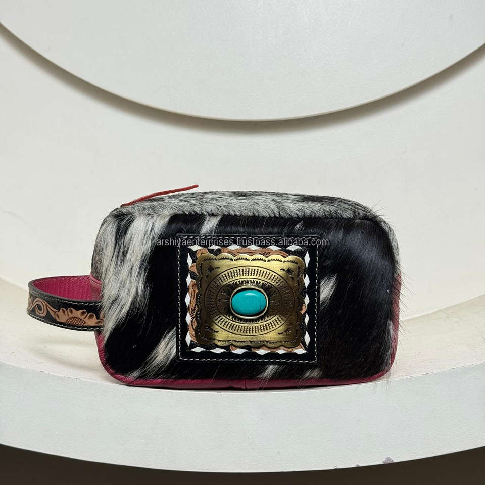 Women's Genuine Tooled Leather Makeup Storage Bag Custom Logo Travel Beach for Toiletry Pouch with Cowhide Zipper Cosmetic Bags