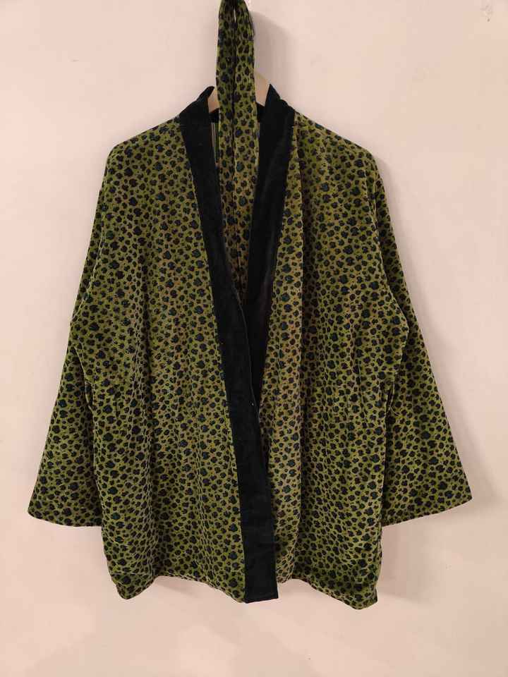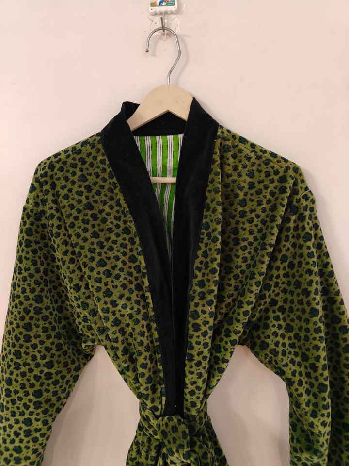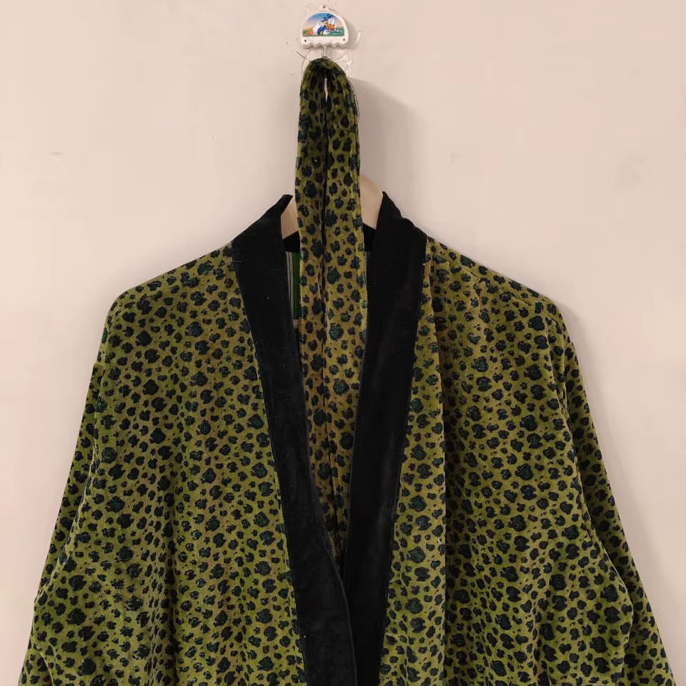 Women's Green Animal Print Velvet Kimono Robe V-Neck Full-Length Long Sleeves Winter Casual Luxury Coat Machine-Washable