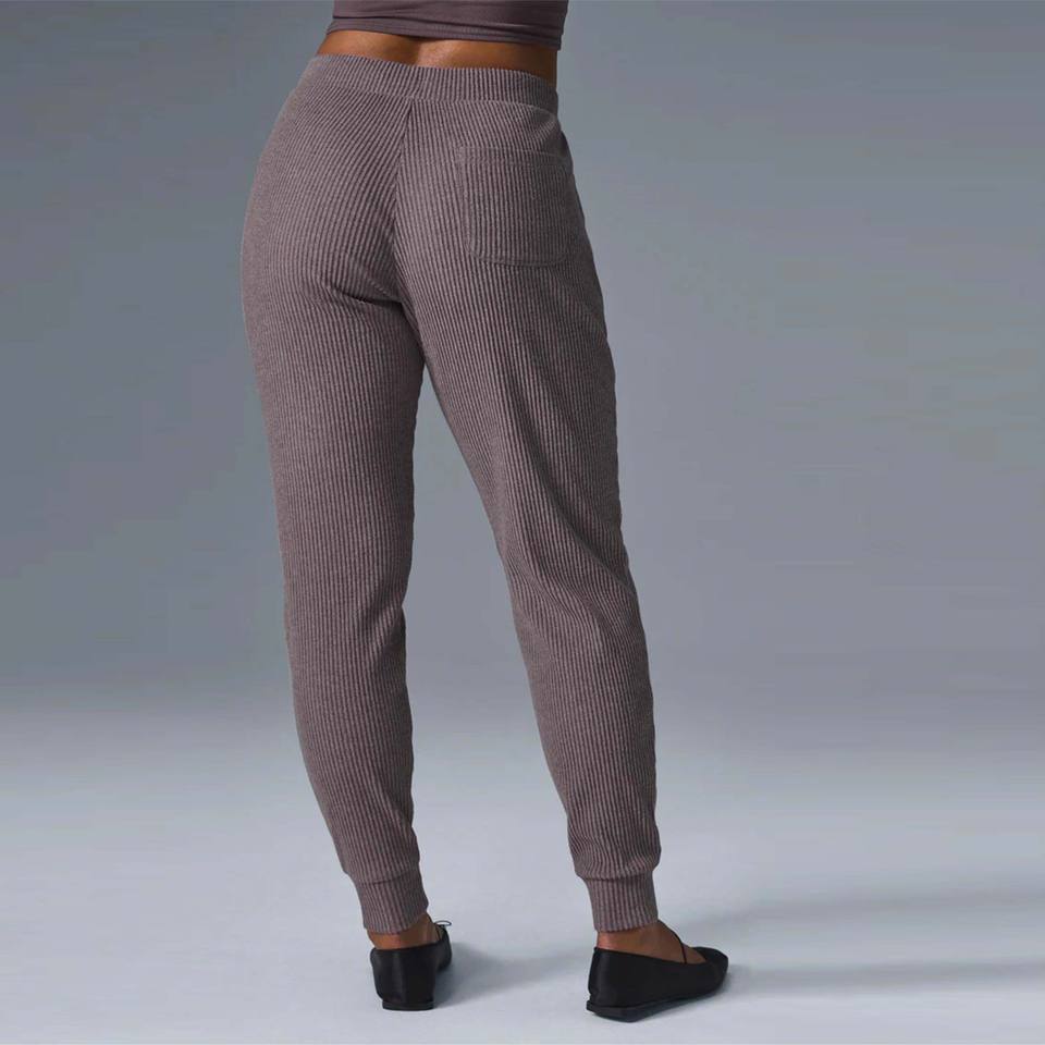 Women's Green Ribbed Jogger Pants Logo High-Waisted Stretchable Silk Fleece Casual Elastic Waist Pockets Joggers Unique Texture