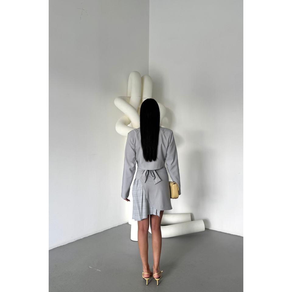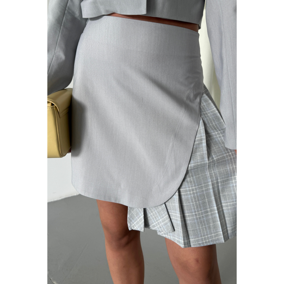 Women's Grey POLYVISCONE Crop Jacket and Skirt Set with Plaid Pleat Detail Suit
