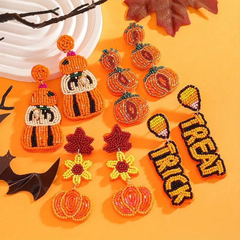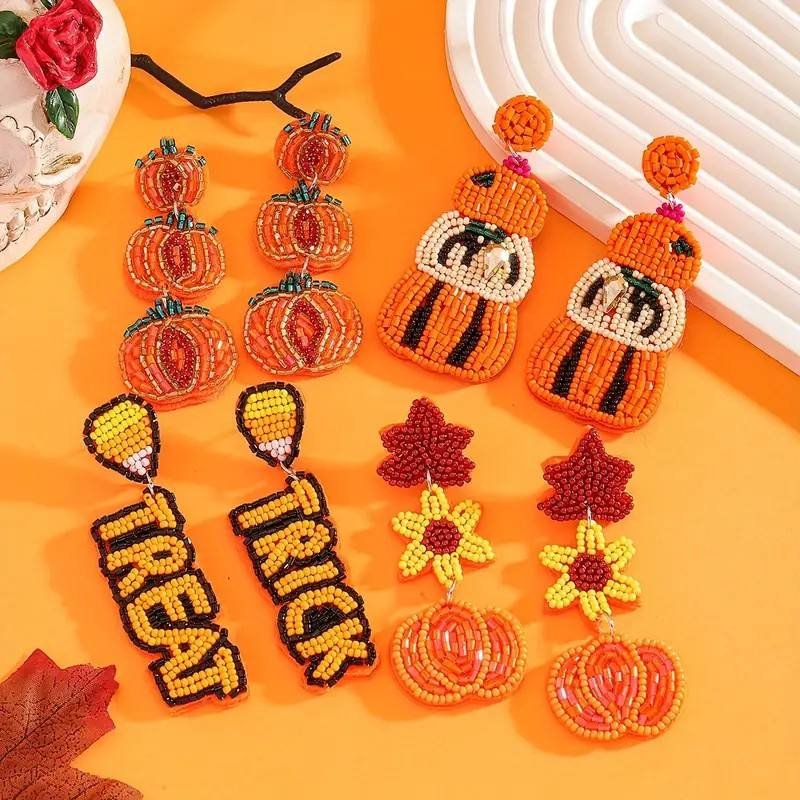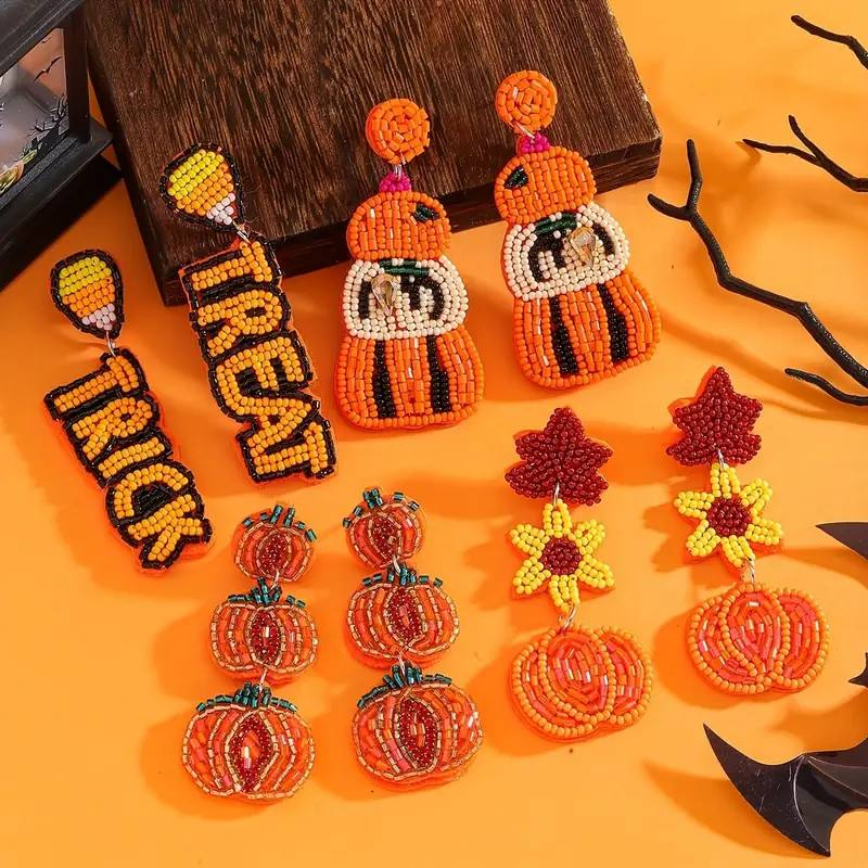 Women's Halloween Bohemian Handmade Rice Bead Drop Earrings Pumpkin Beaded Dangle Earrings In Orange Yellow Red Green Black