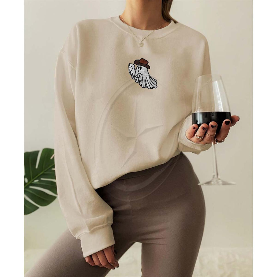 Women's Halloween Sweatshirt Embroidered Korean Ghost Long Sleeve Crewneck Pullover Top Cotton Terry Knit Printed Spooky Season