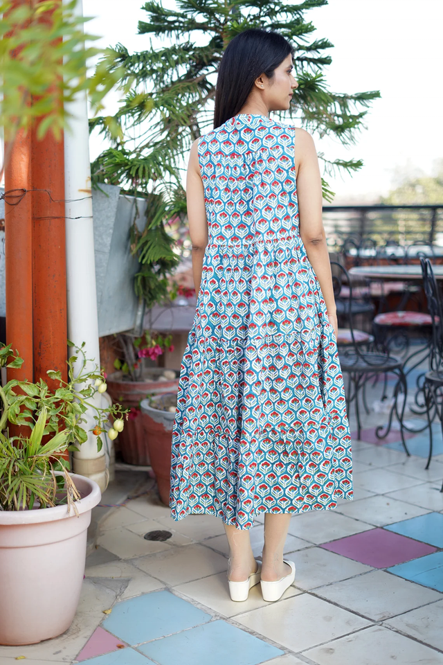 Women's Hand-Block Printed Cotton Summer Dress 100% Sustainable Maxi Length Solid Pattern for Autumn/Sumer Season