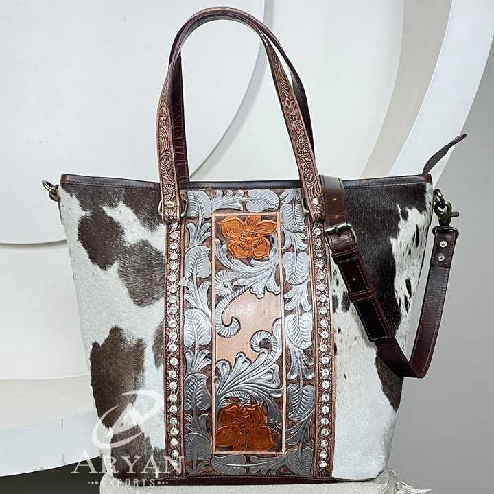 Product Name:Hand Tooled Cowhide Leather Crossbody Tote Bag