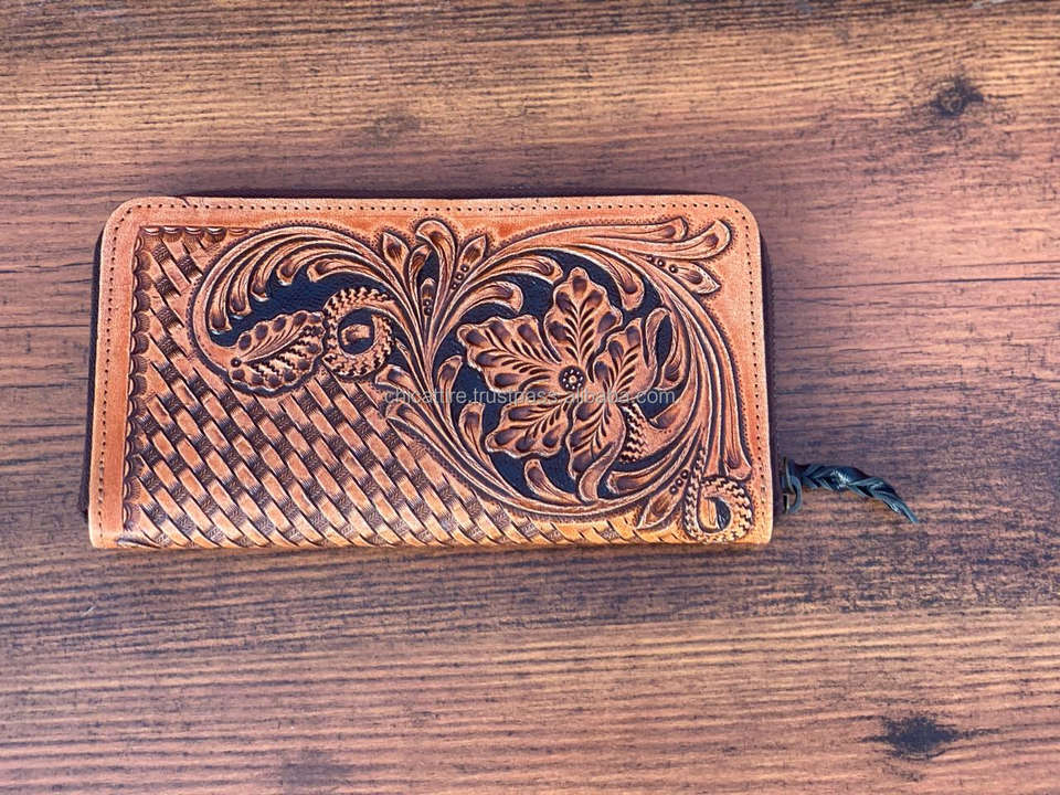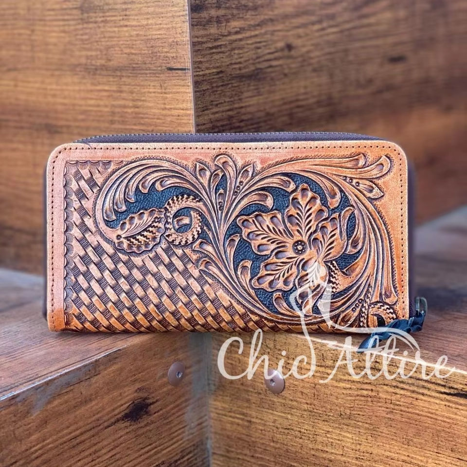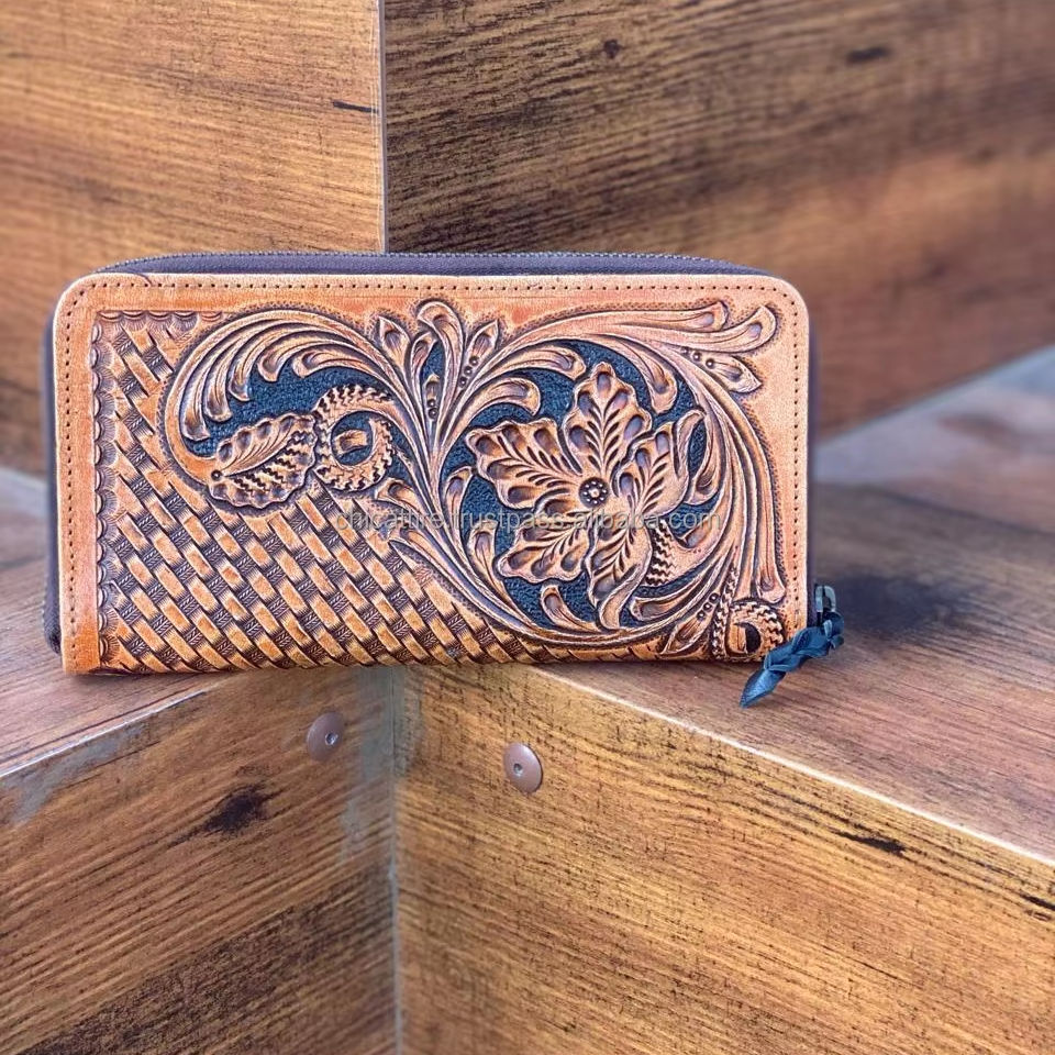 Women's Hand Tooled Leather Credit Card Wallet Western Leather Clutch Genuine Cowhide Hand Stitched Leather Wallet Gift for Her