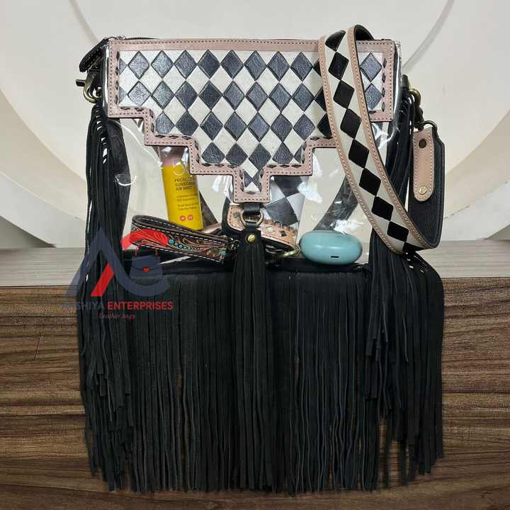 Women's Handcrafted Western Style Black & White Checkered Cowhide Leather Transparent PVC Clear Bag Crossbody & Shoulder Handbag