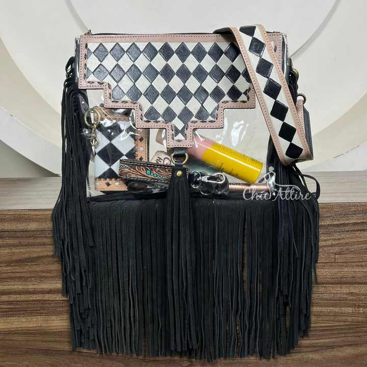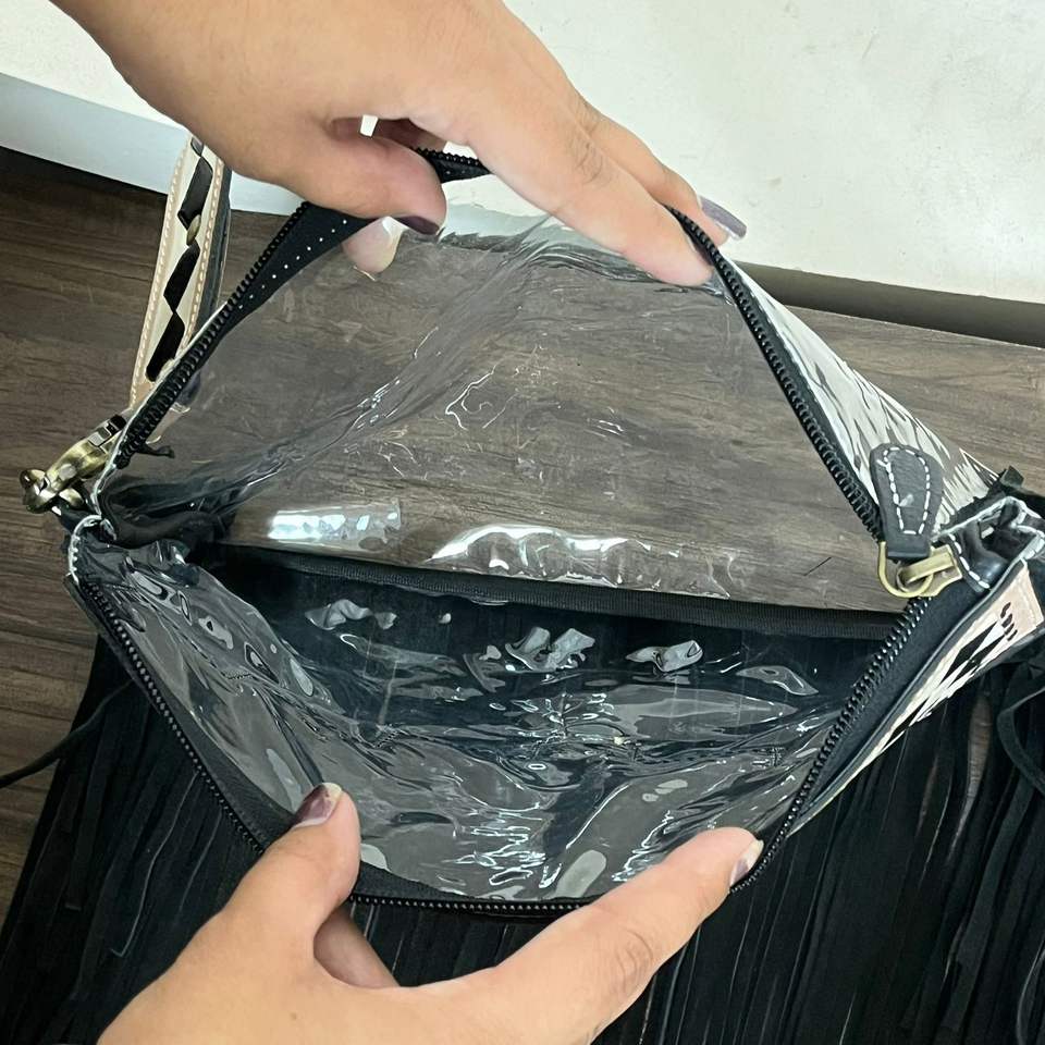 Women's Handcrafted Western Style Black & White Checkered Cowhide Leather Transparent PVC Clear Bag Crossbody & Shoulder Handbag